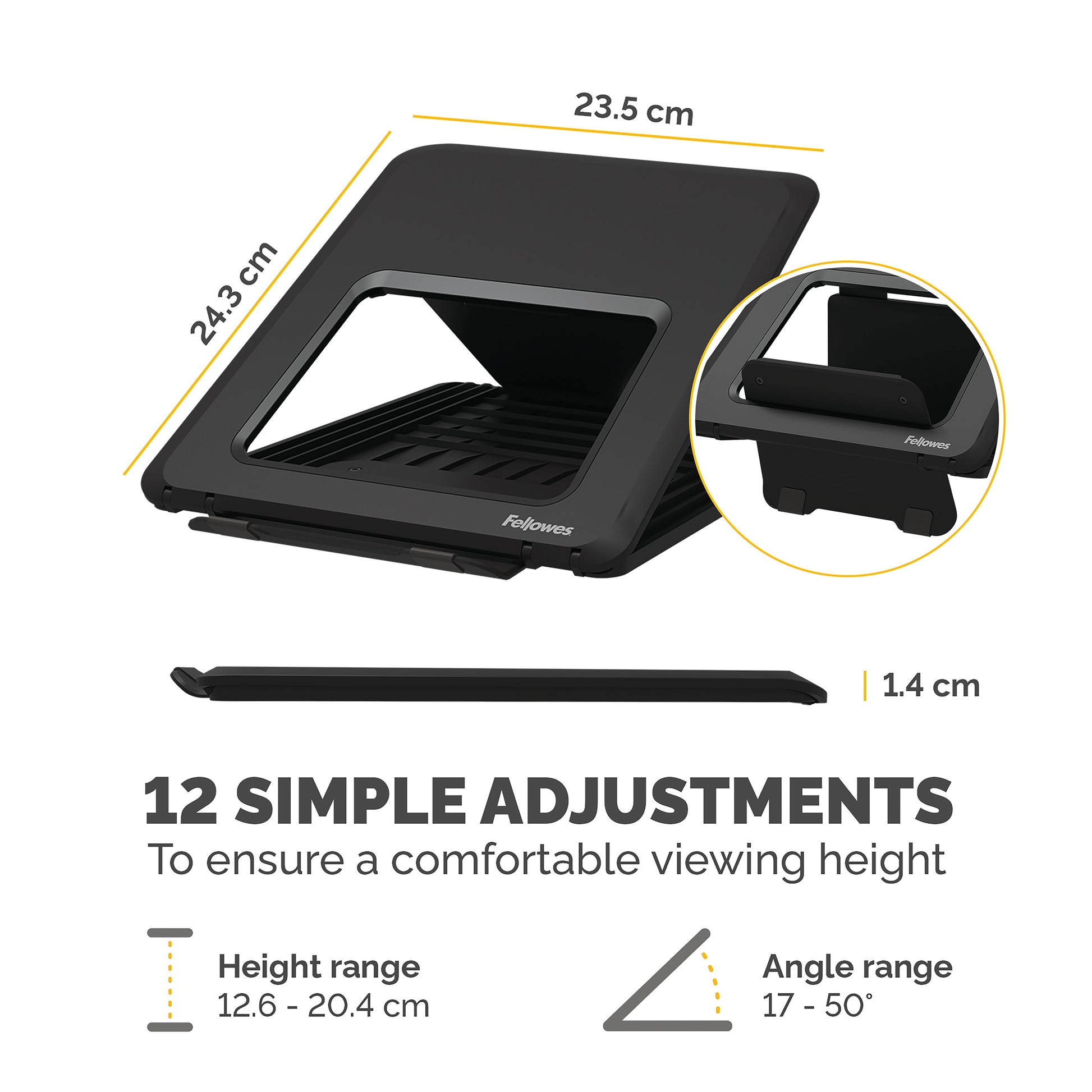 Fellowes Breyta Laptop Riser Black 100016558. Compact, lightweight, portable. Easy to set up and adjust. Ideal for hybrid working. 12 height adjustments with unique front lift. Holds up to 15 inch laptops weighing up to 4kg.