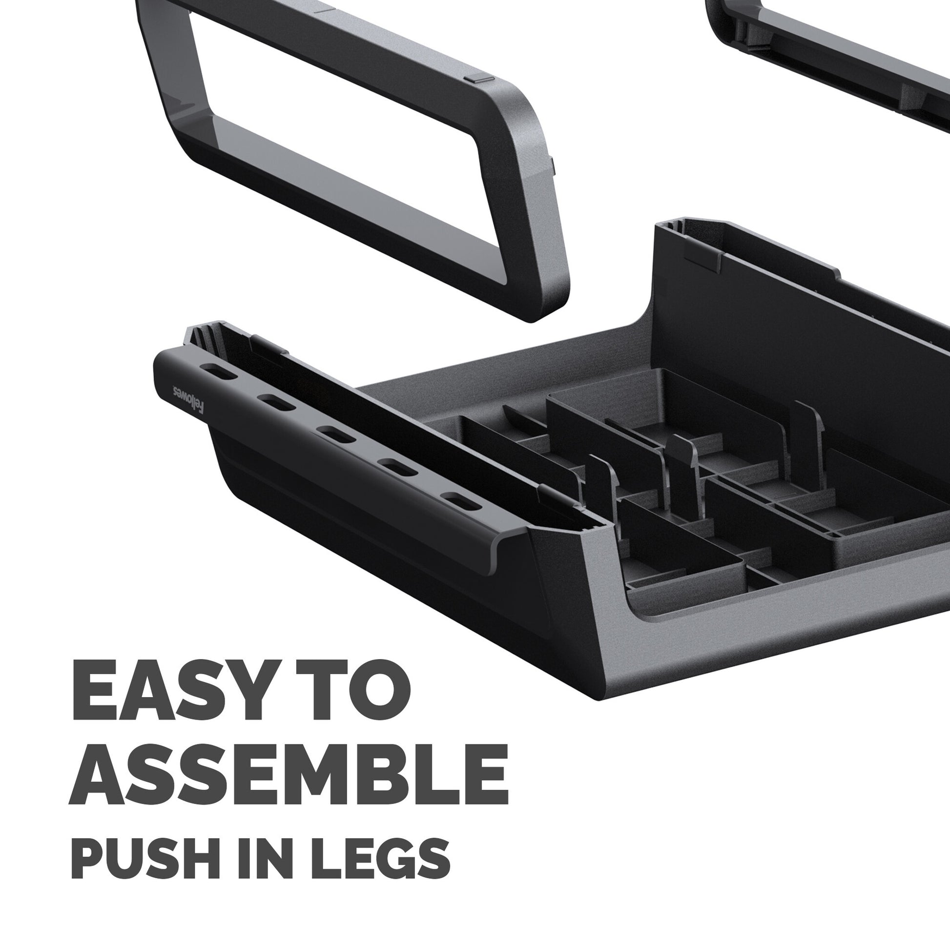 Discover a new level of ergonomic comfort with the Breyta monitor stand, offering three height settings to suit your unique needs, ensuring you work comfortably and efficiently. Say goodbye to clutter with its smart design – legs that easily clip underneath the platform, providing convenient storage options for a tidy workspace. Stay connected and powered up with the built-in device channel, offering easy access for device charging while you work. This monitor stand is portable and hassle-free to set up, adjust, and store away, making it the perfect choice for the ever-changing demands of hybrid work environments. Made from materials which are 100% recyclable, it's a sustainable choice built to last and reduce your environmental footprint. Enhance your workspace with the Breyta monitor stand – where comfort, style, and sustainability come together seamlessly to elevate your productivity and well-being. This sustainable product is built to last with a 5-year extended warranty, and access to the best customer service to help with any queries.