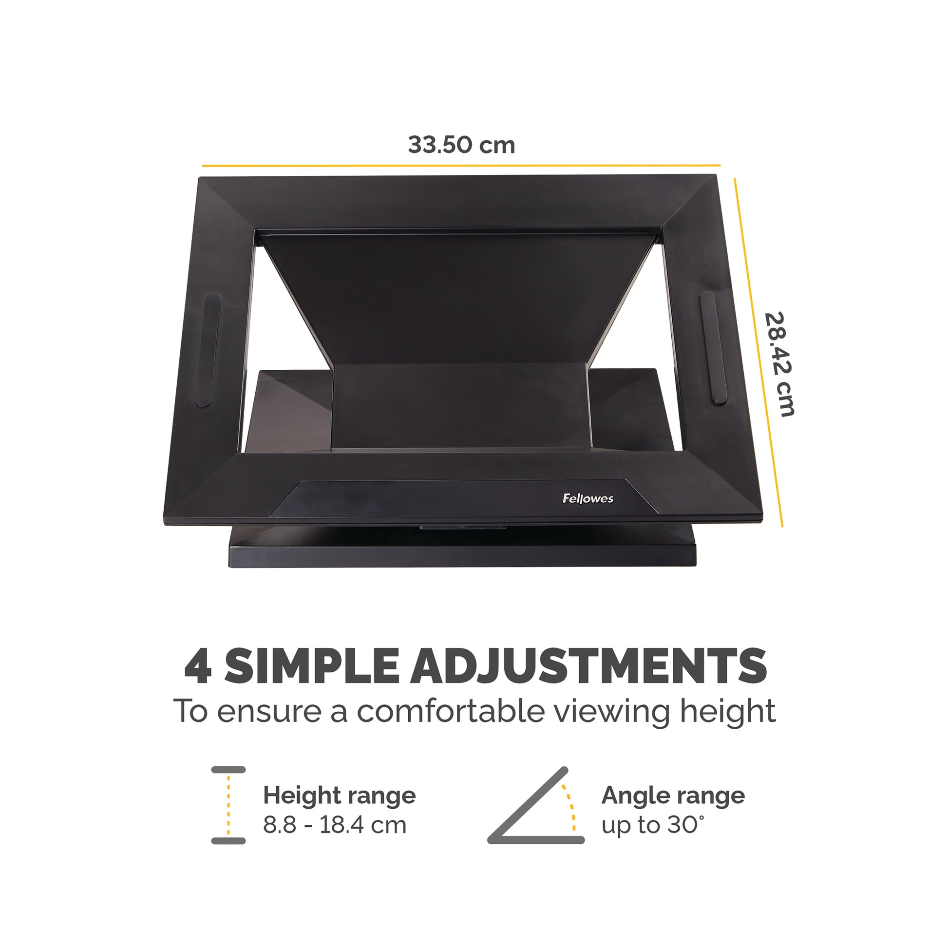 Fellowes Designer Suites Laptop Riser. Height adjustable. Angle adjustable between 0-30 degrees for increased personal comfort. Stabilising front edge prevents laptop from sliding off the unit. Cooling vents help dissipate laptop heat.