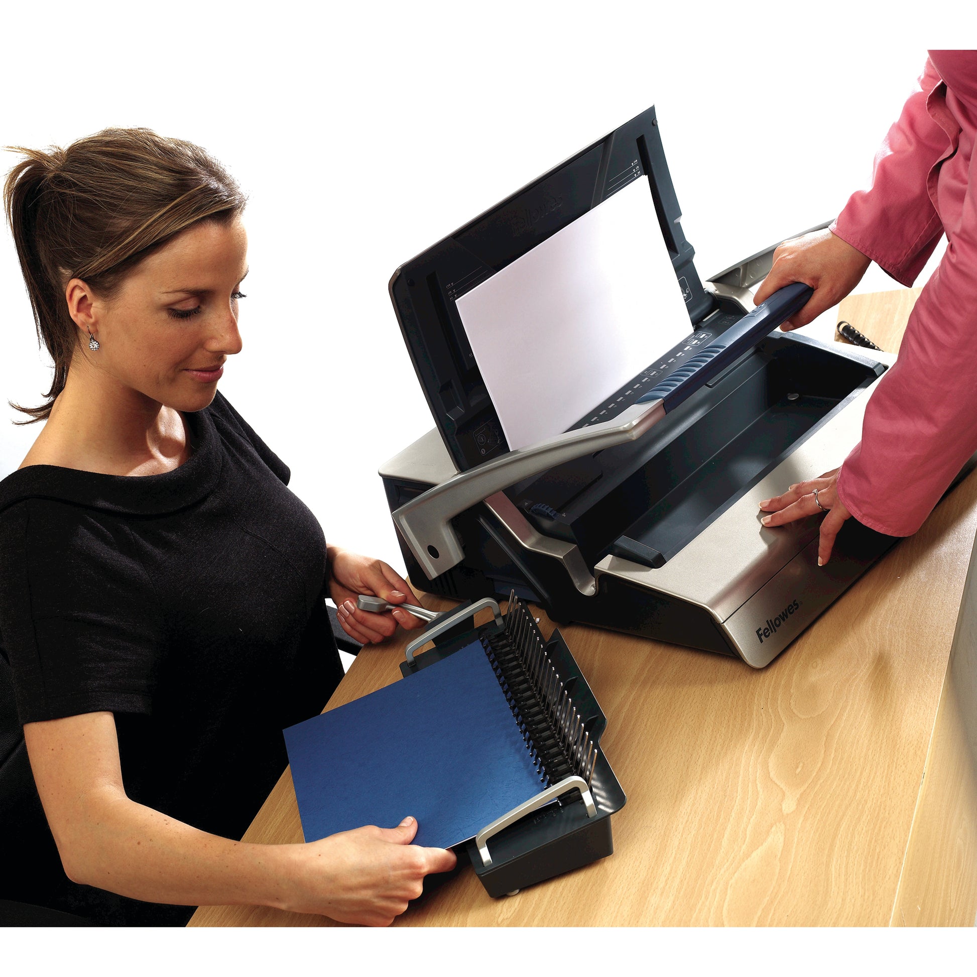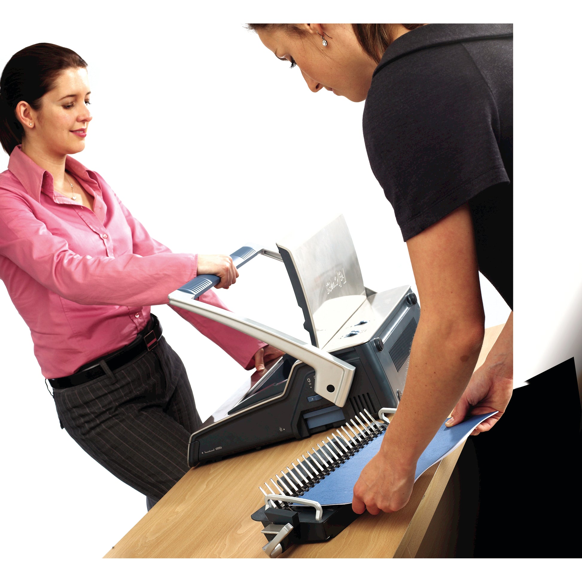 High capacity comb binder with Electric punch mechanism punches up to 25 sheets at a time. Binds up to 500 sheets of paper with a maximum comb size of 50mm. Features a document and comb size guide and adjustable paper stop. Starter kit included.