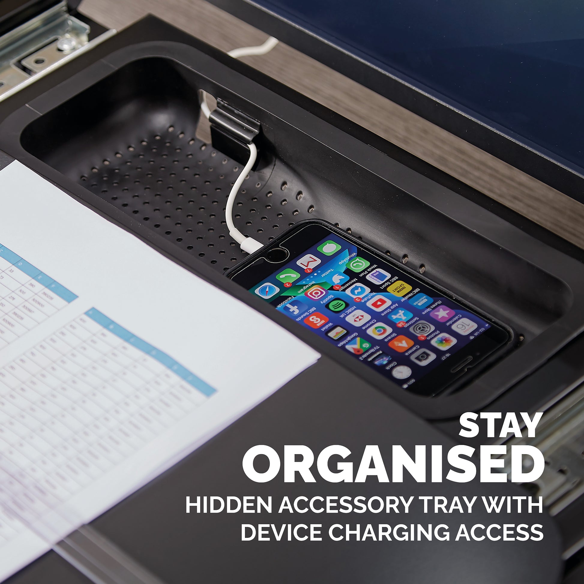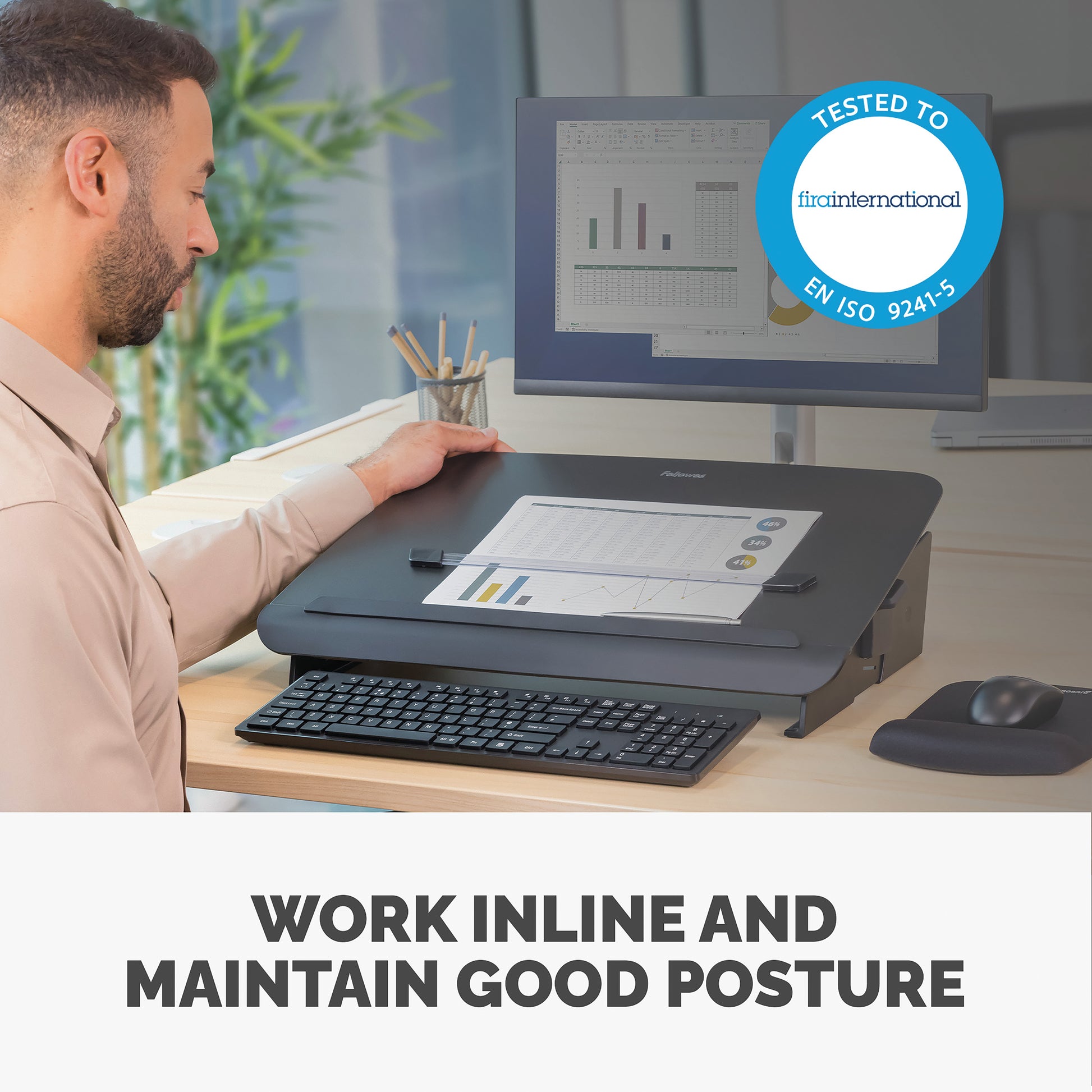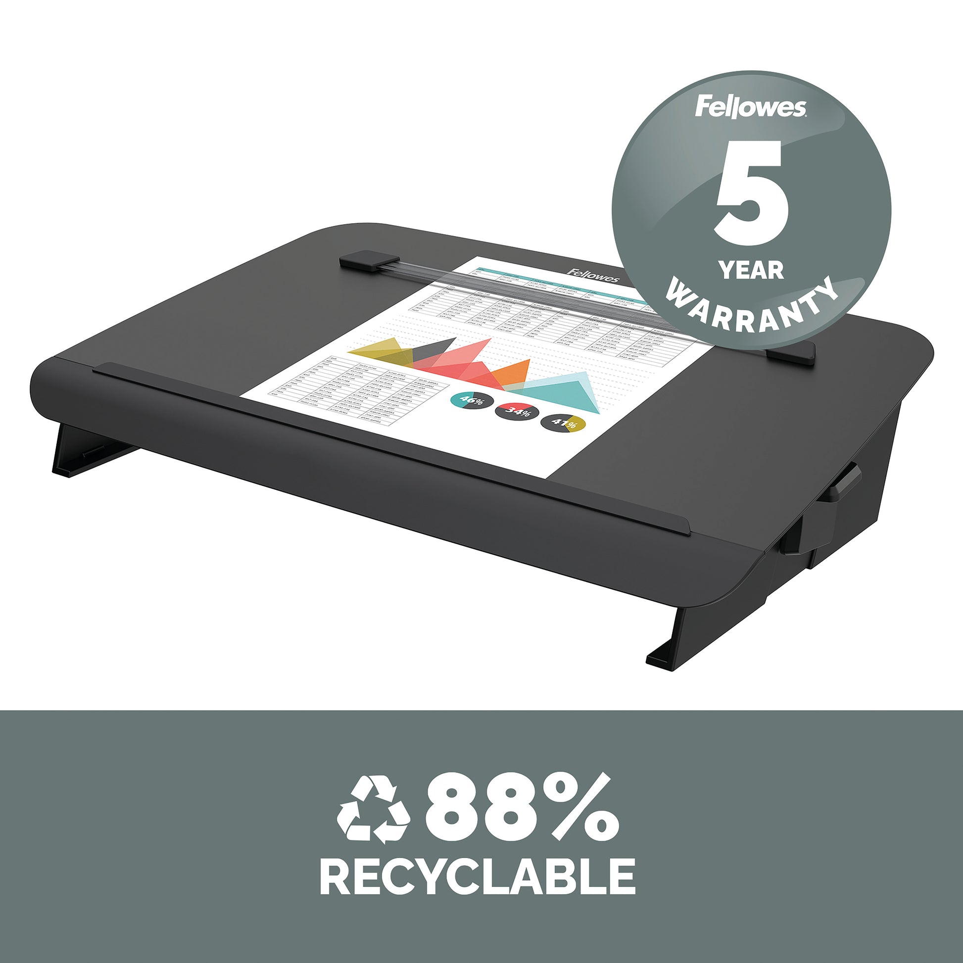 Fellowes Hana Document/Writing Slope Adjustable Position Black 8055701. Enables you to work ergonomically. 5 height/angle settings. Platform glides forward to maximise desk space. Accessory tray with device charging access. Magnetic line guide.