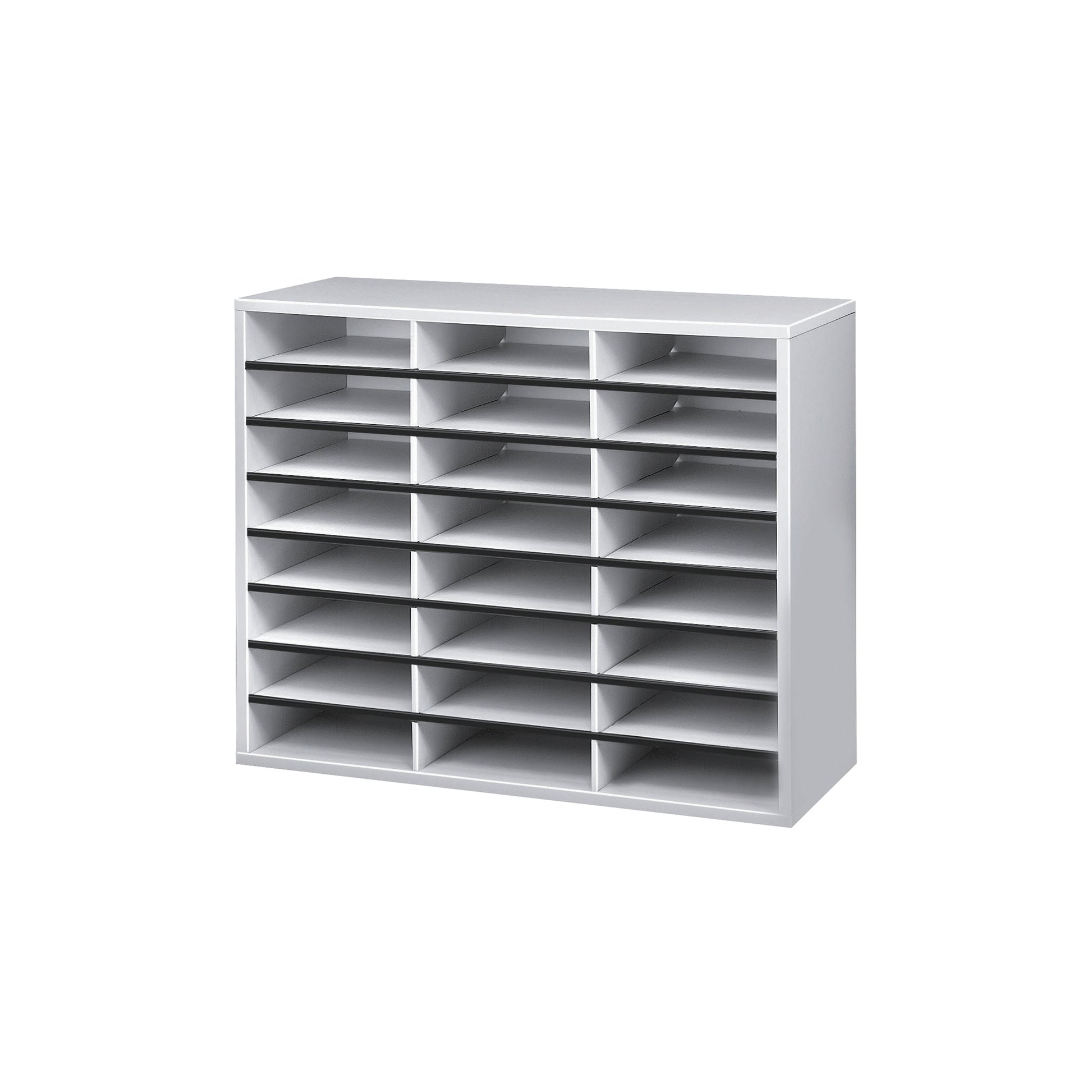 New range of pigeon hole units ideal for sorting literature mail etc. Melamine laminated particle board shell for long life with a corrugated board divider system. Easy to construct and dove Grey in colour. 24 compartment. Dimensions: W737xD302xH594mm.