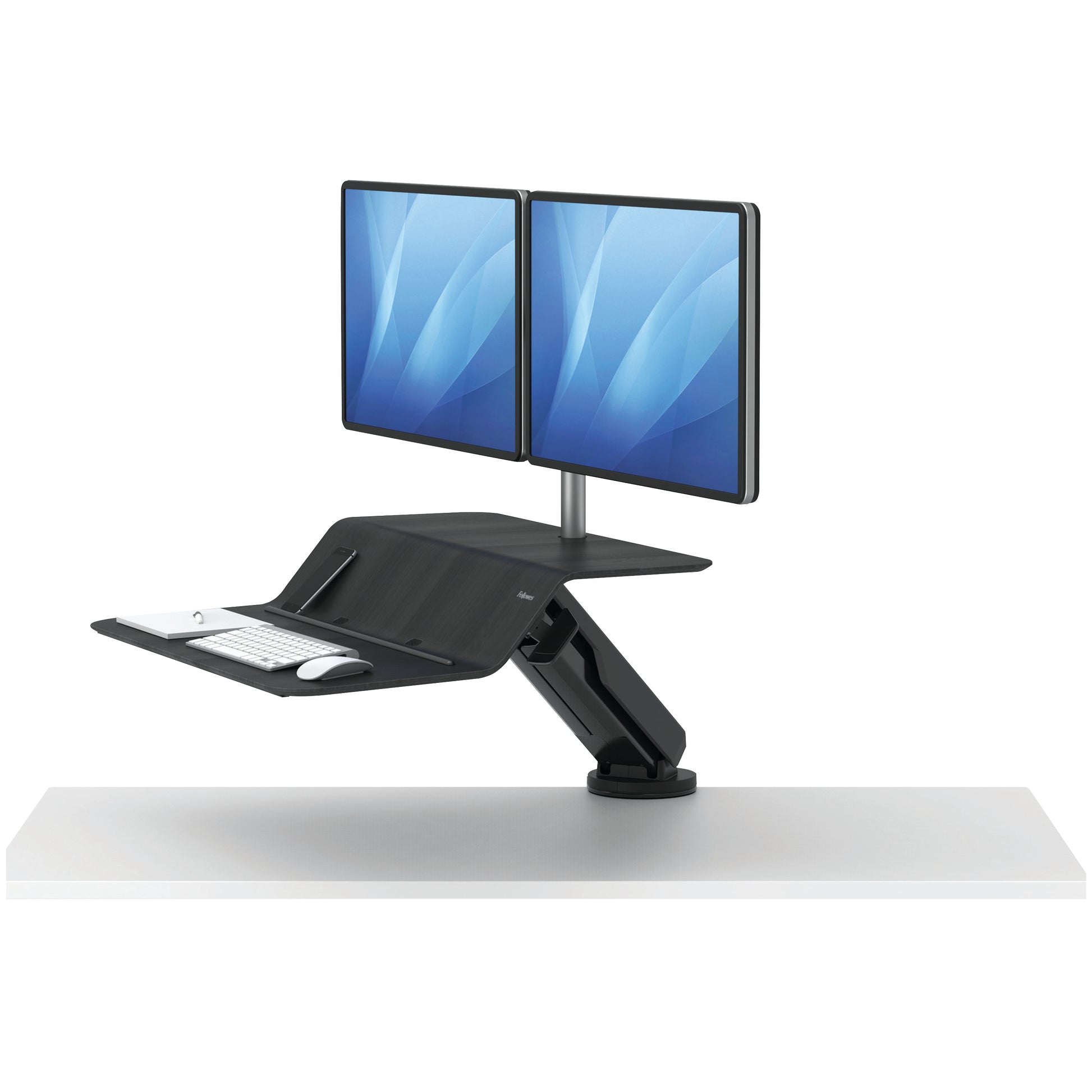 Fellowes Lotus RT Sit/Stand Workstation Dual Screen Black 8081601. Suitable for dual screen set up. Device Channel with Charging Access. Cable Management. Smooth Lift Technology. Swivels 180 degrees. Weight Capacity: 15.8kg.