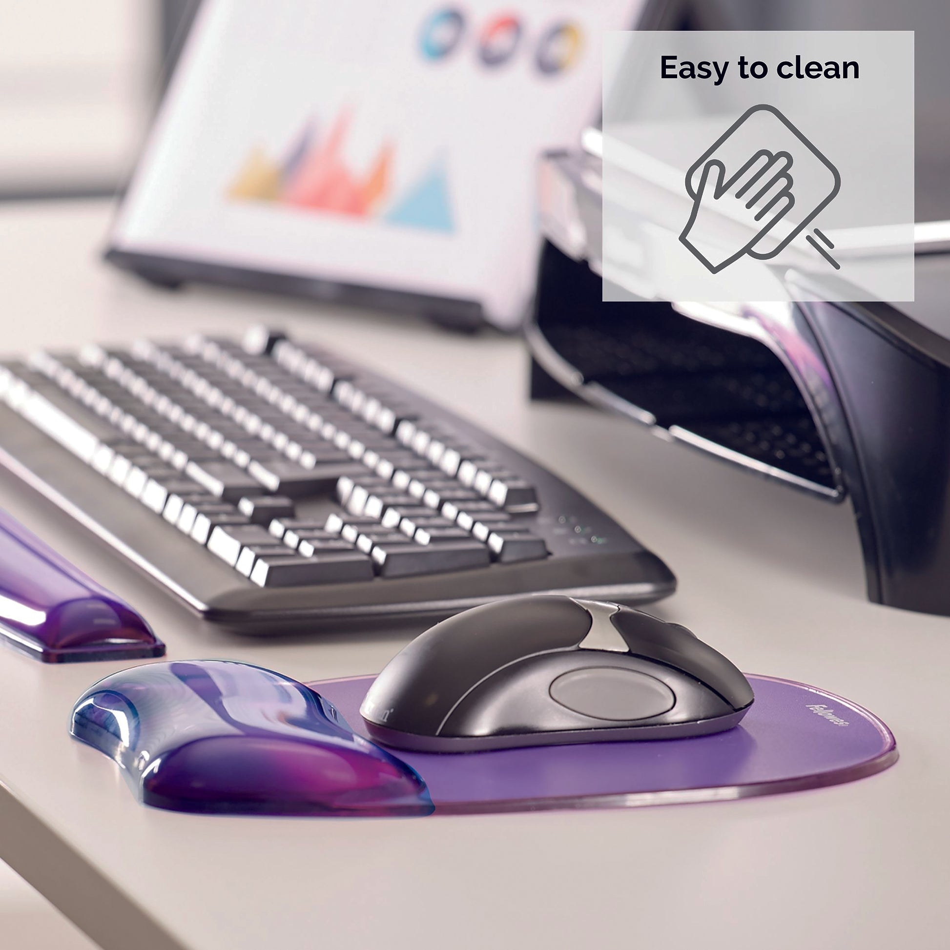 Fellowes Crystal Mouse pad and Wrist Rest. Ergonomically designed transparent crystal gel mouse pad and wrist rest that supports pressure points thus alleviating and reducing strain to the wrist and surrounding area. Size: 235x200x25mm. Colour - Purple.