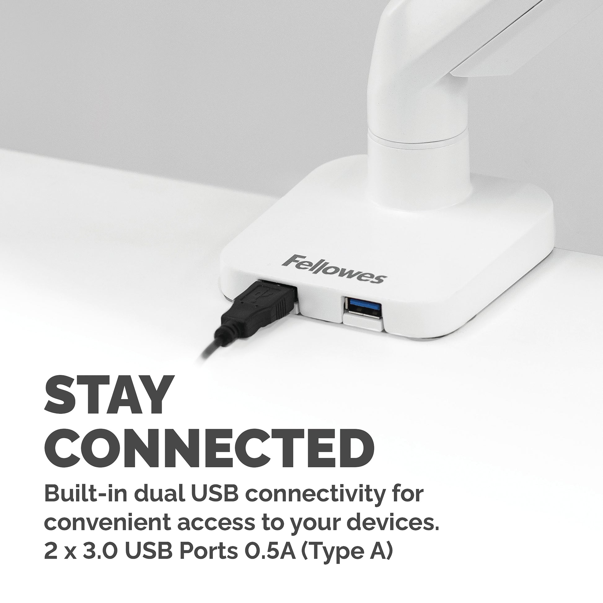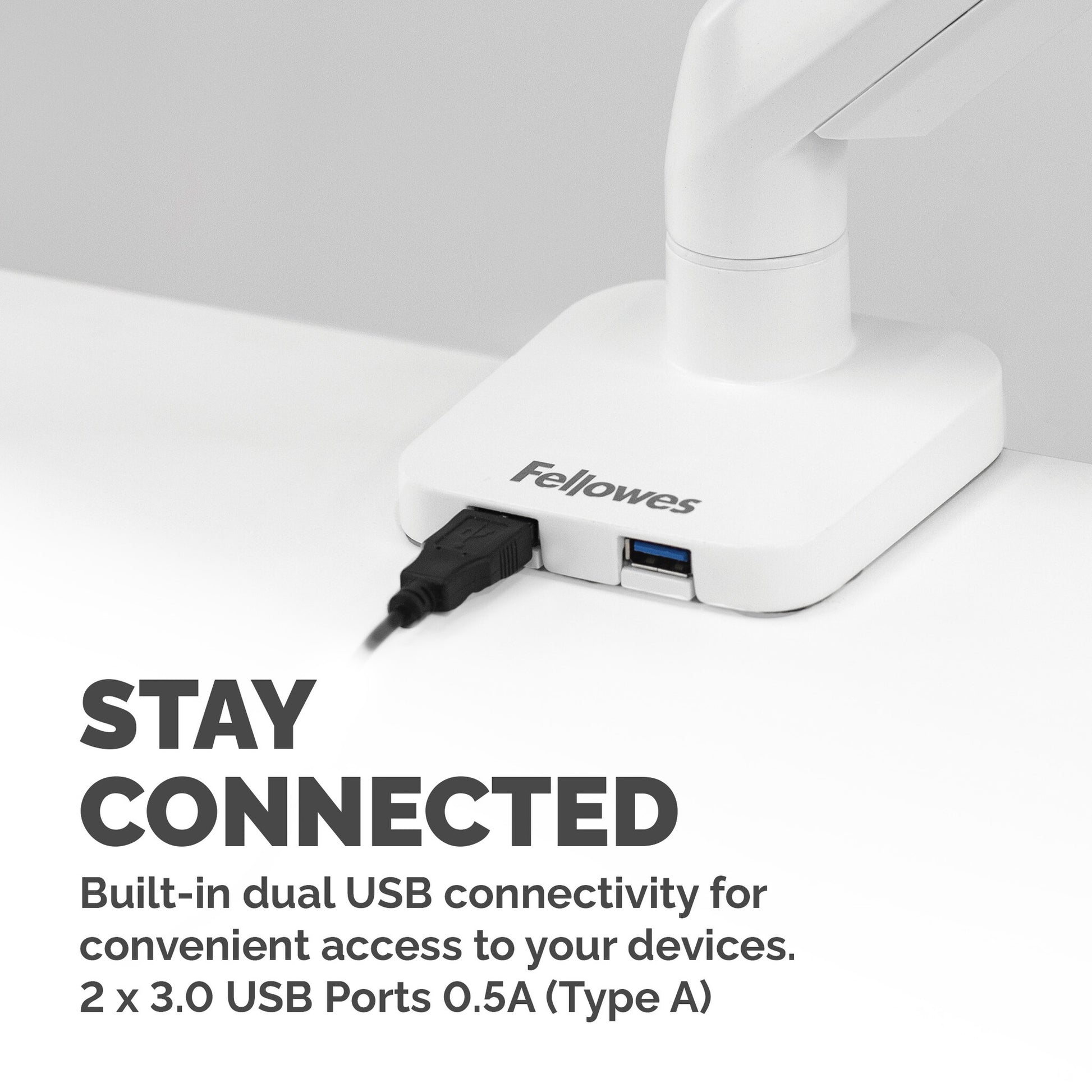 Sitting or standing with bad posture all day using a computer is bad for your health. Leaning forwards or tilting your head up or down not only causes back and neck strain but is also bad for your eyes. Fellowes Platinum Series monitor stands will improve your ergonomic posture and reduce back neck and eye strain. With ever shrinking office spaces, using monitors stands means you can free up valuable work space to become more organised and productive. With effortless adjustment you can collaborate and share information with colleagues easily, making them perfect for hot desks or shared desks. This fully independent adjustable monitor stand by Fellowes can pan 180°, tilt +/-45° (90°) and can rotate 360° via innovative gas spring technology allowing for effortless movement. Built in dual USB connectivity and intuitive cable management allows you to stay connected and minimise clutter at the same time with the Fellowes Platinum Series monitor mount. Easily mounted via clamp or grommet, each arm holds a monitor up to 8kg (up to 40" monitors) and meets VESA monitor bracket standards.