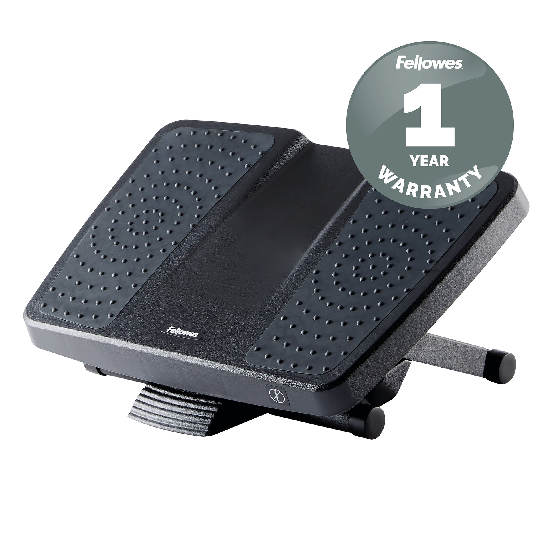 Fellowes Professional Series Ultimate Footrest Black 8067001. 3 height settings of 100mm, 135mm and 165mm. Massage surface for comfort. Rocking motion aids circulation. Colour: Black. Dimensions: W457 x D114 x H356mm0.