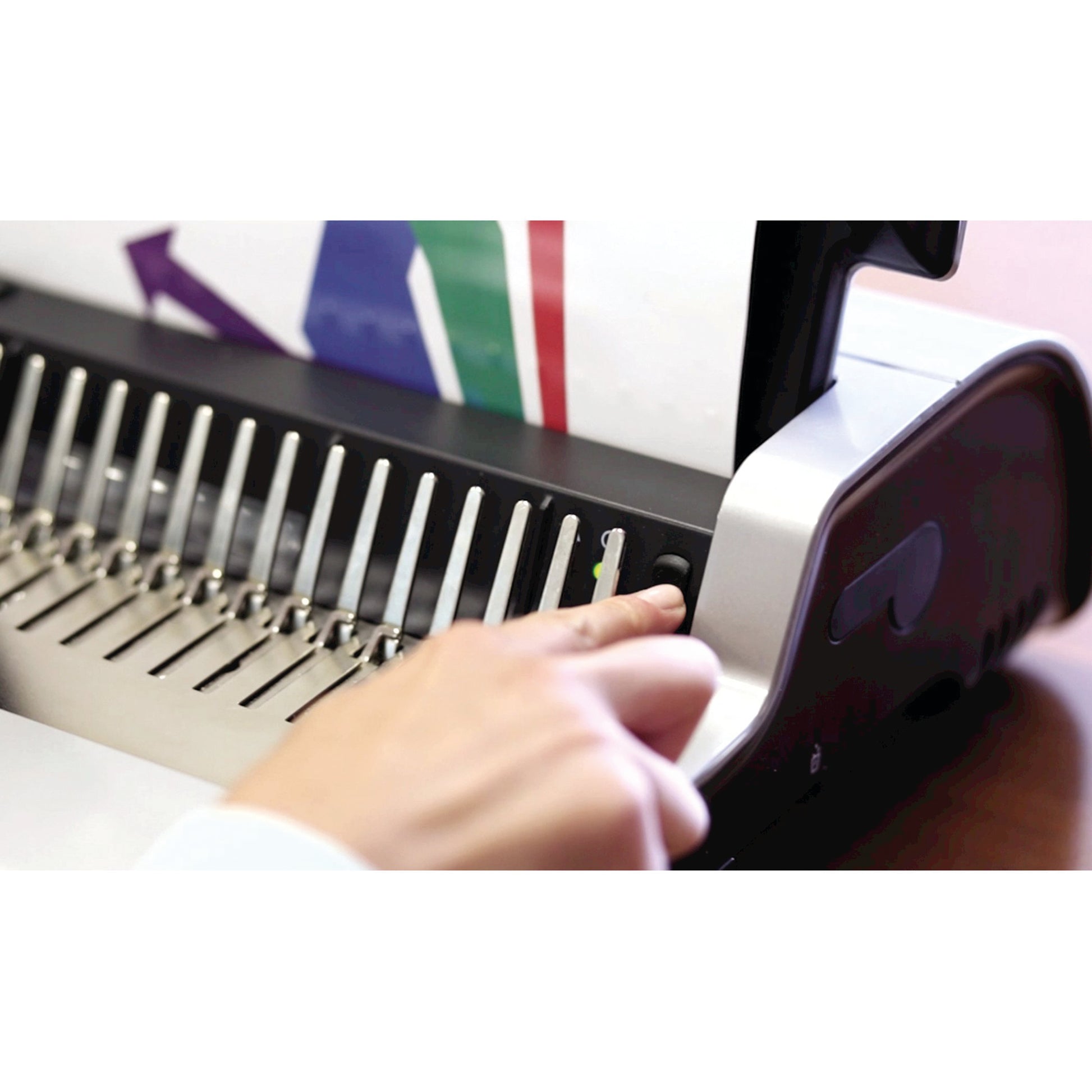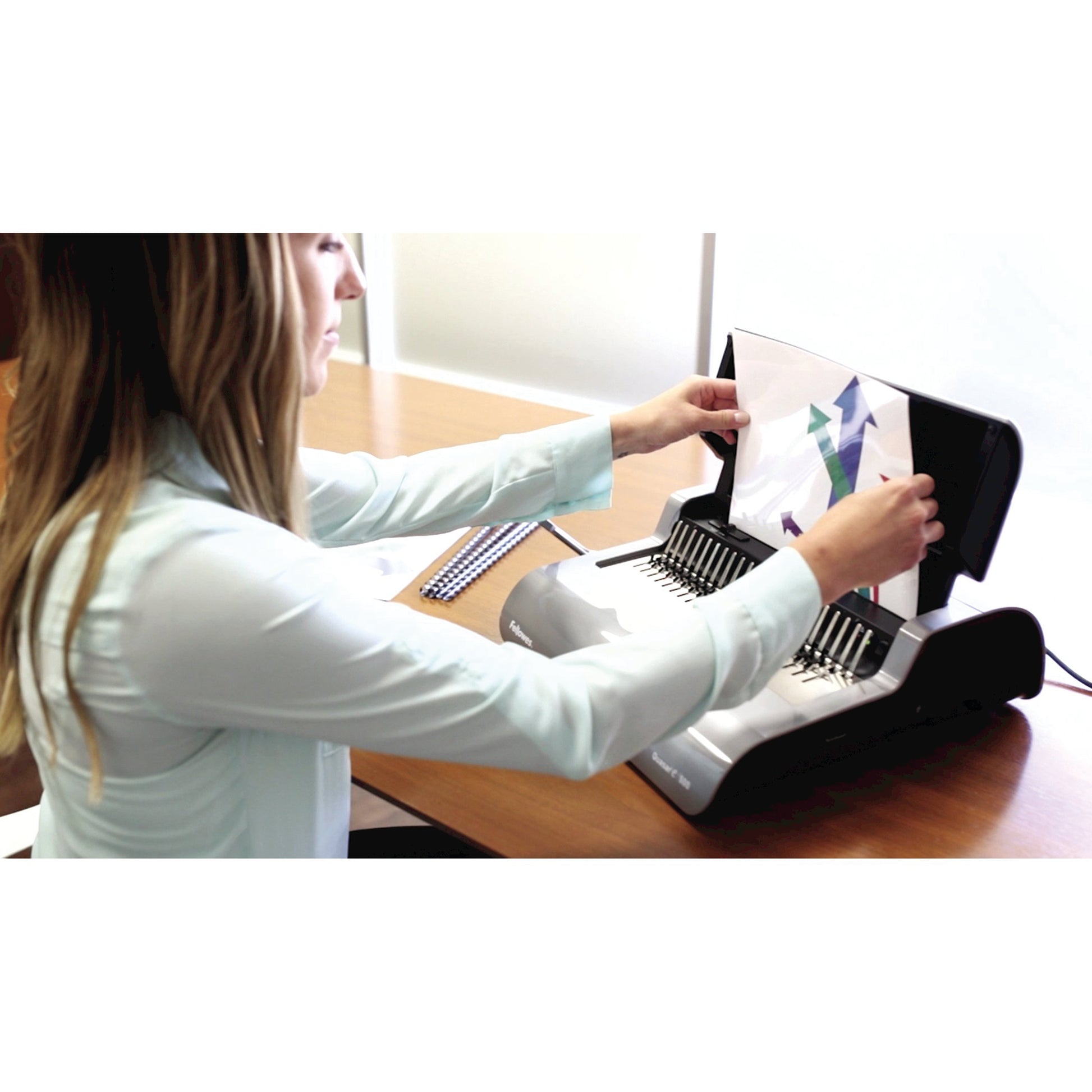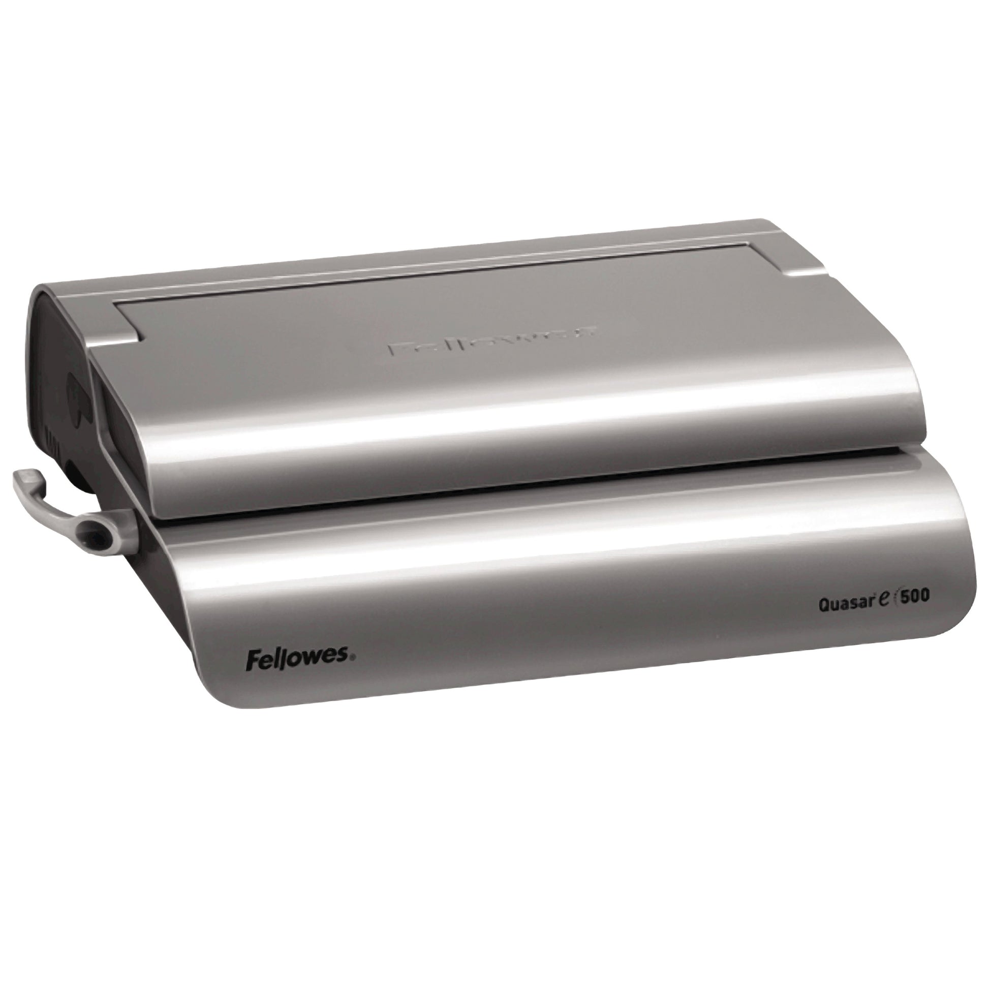 Fellowes Quasar 500 Electric comb binder punches up to 20 sheets and binds up to 500 sheets. Features document thickness and comb sizing guide built in comb storage tray and vertical sheet loading for accuracy.