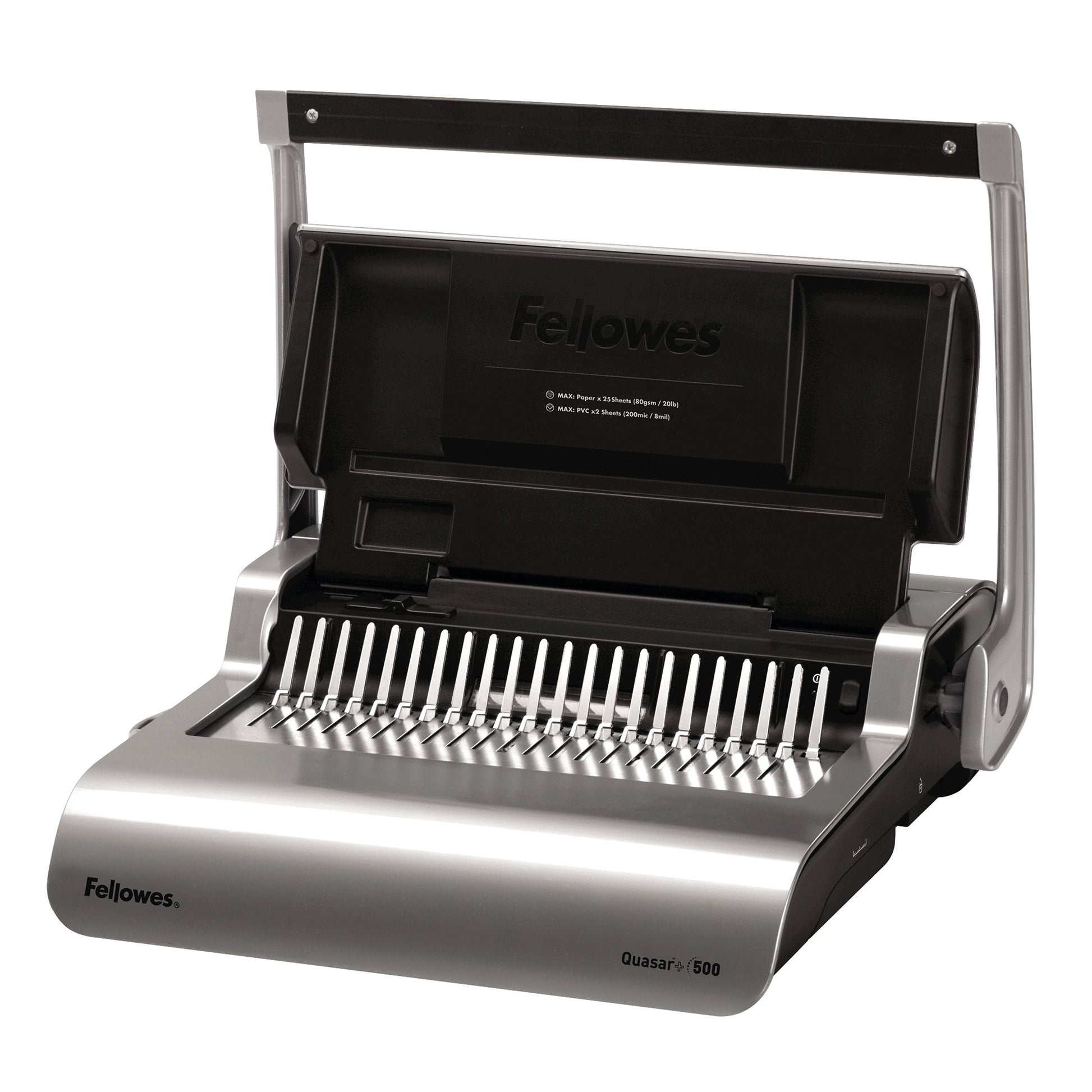 Fellowes Quasar Manual Comb Binding Machine. Ideal for the binding requirements of medium to large offices. Allows users to punch and bind continuously. 20 sheet punch capacity. 500 sheet binding capacity.