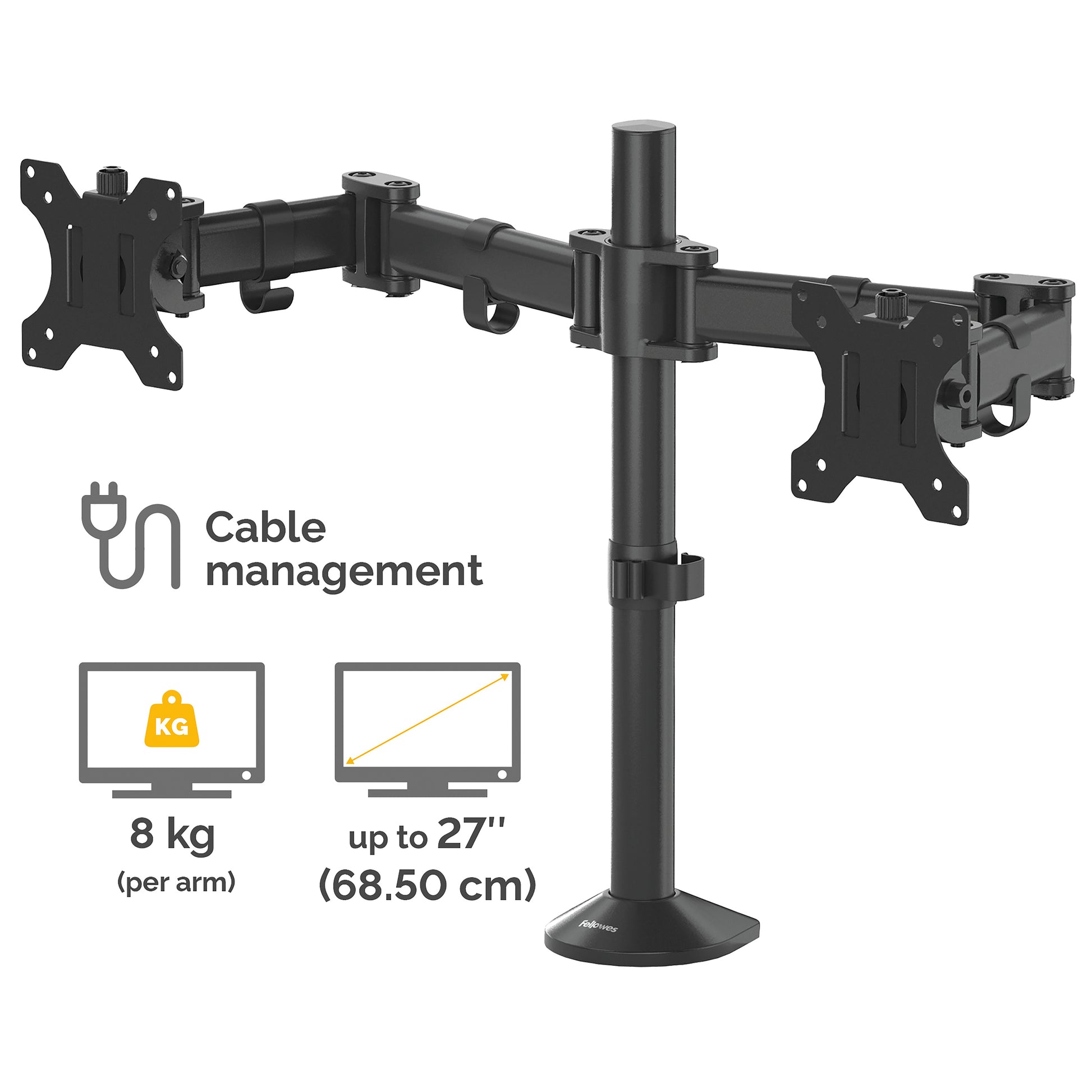Sitting or standing with bad posture all day using a computer is bad for your health. Leaning forwards or tilting your head up or down not only causes back and neck strain but is also bad for your eyes. The Fellowes Reflex dual monitor stand will improve your ergonomic posture and reduce back neck and eye strain. This fully independent dual monitor mount by Fellowes is adjustable by height and depth to achieve optimum viewing control and a cost effective ergonomic solution. Reduce clutter in your workspace with the Reflex dual monitor mount which features an intuitive cable management system which helps keep your cables organised. Position documents to a more comfortable, ergonomic viewing position with a maximum height of 45cm and reach of 38cm. This dual monitor arm holds 27” (68.5cm) monitors weighing up to 8kg each. Desk clamp and grommet mount included for secure and easy attachment options. Free up valuable work space for maximum productivity and collaborate with colleagues effortlessly with the Reflex Dual Monitor Arm.