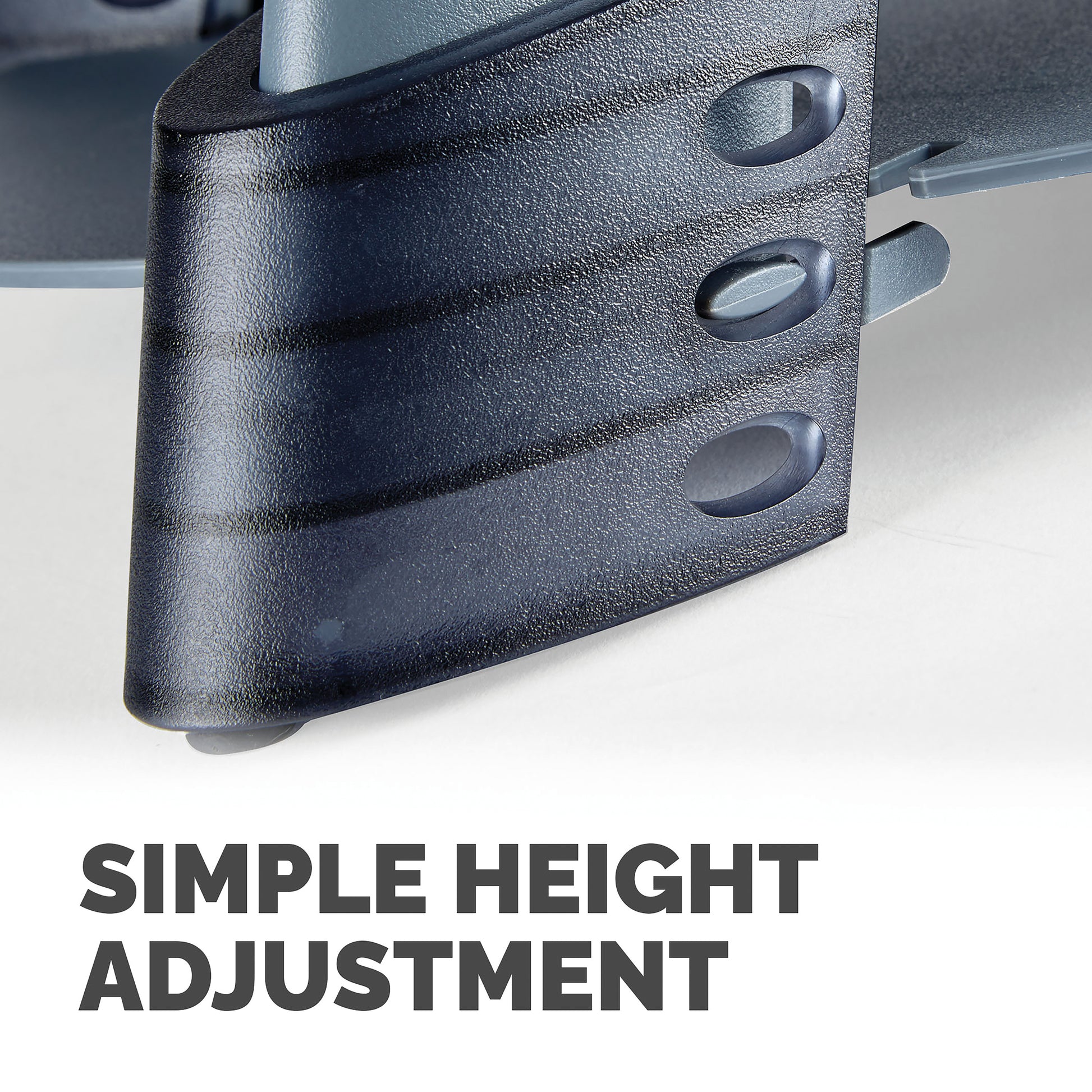 TFT monitor riser with unique height adjustability from 7.5cm to 11cm. Platform rotates 45 degrees to assist shared viewing. Supports up to 14kg. Includes storage tray for paper supplies. Modern design complements flat panel TFT/LCD monitor styles.