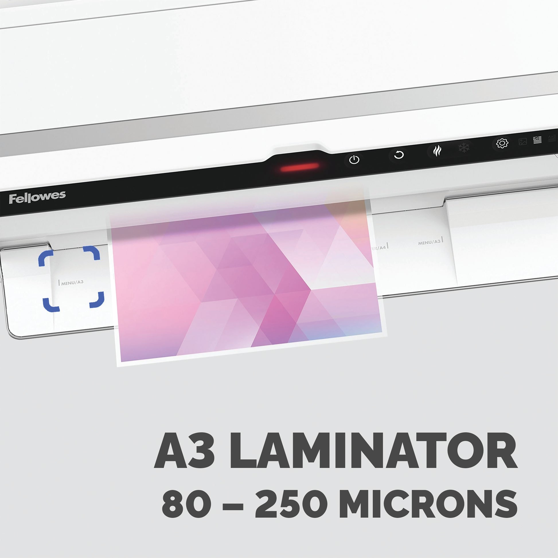 Fellowes Venus A3 Laminator 230V EU/UK Includes Bonus Pouch Pack 5746703. InstaHeat Technology. Accepts all pouches up to A3, 250 microns (2x250). Auto reverse for productive, jam free performance. AutoSense Technology. Clean Alert System.