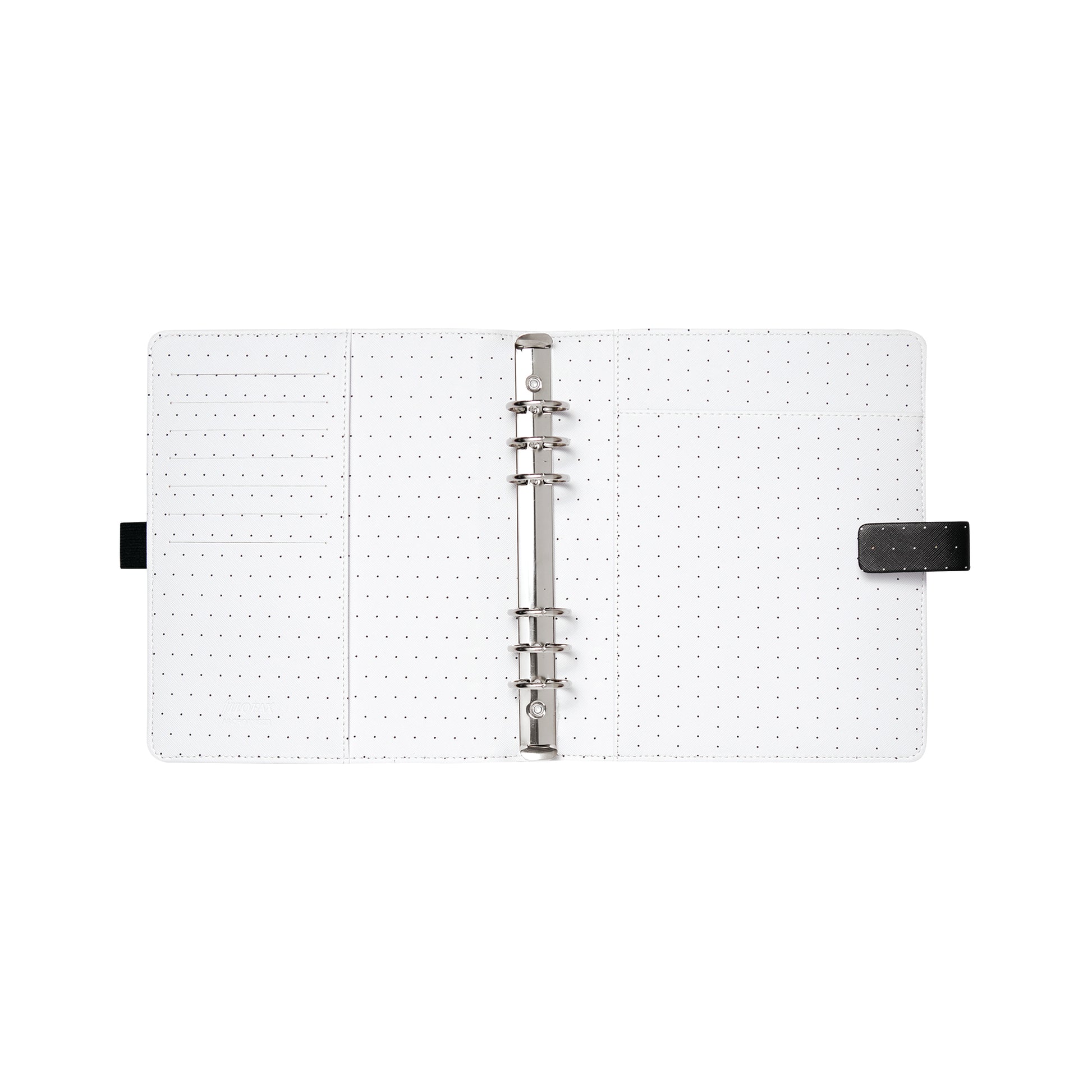 Filofax Moonlight Personal Organiser Black 022654. Compatible with Filofax Personal organiser refills. Lined inside with slip pockets. Closure strap with popper to secure contents. 6-ring mechanism. Supplied with a week to view diary.