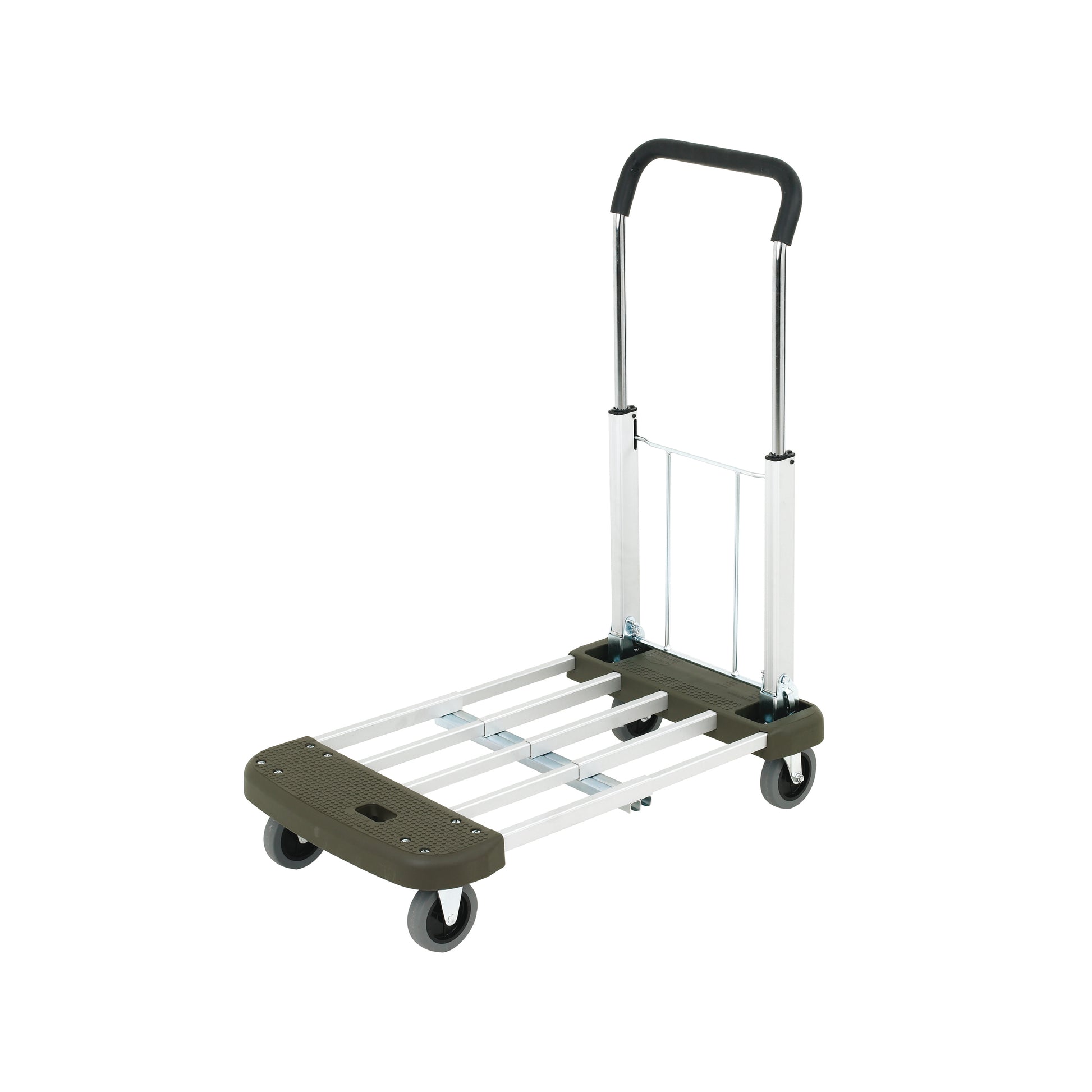 Lightweight and versatile folds to compact size. Telescopic folding. Expandable base to suit different loads. 2-fixed/2-swivel rubber tyred castors. Comfort handle and strong moulded plastic ends. Overall - L760x W440xH870mm. Non returnable.