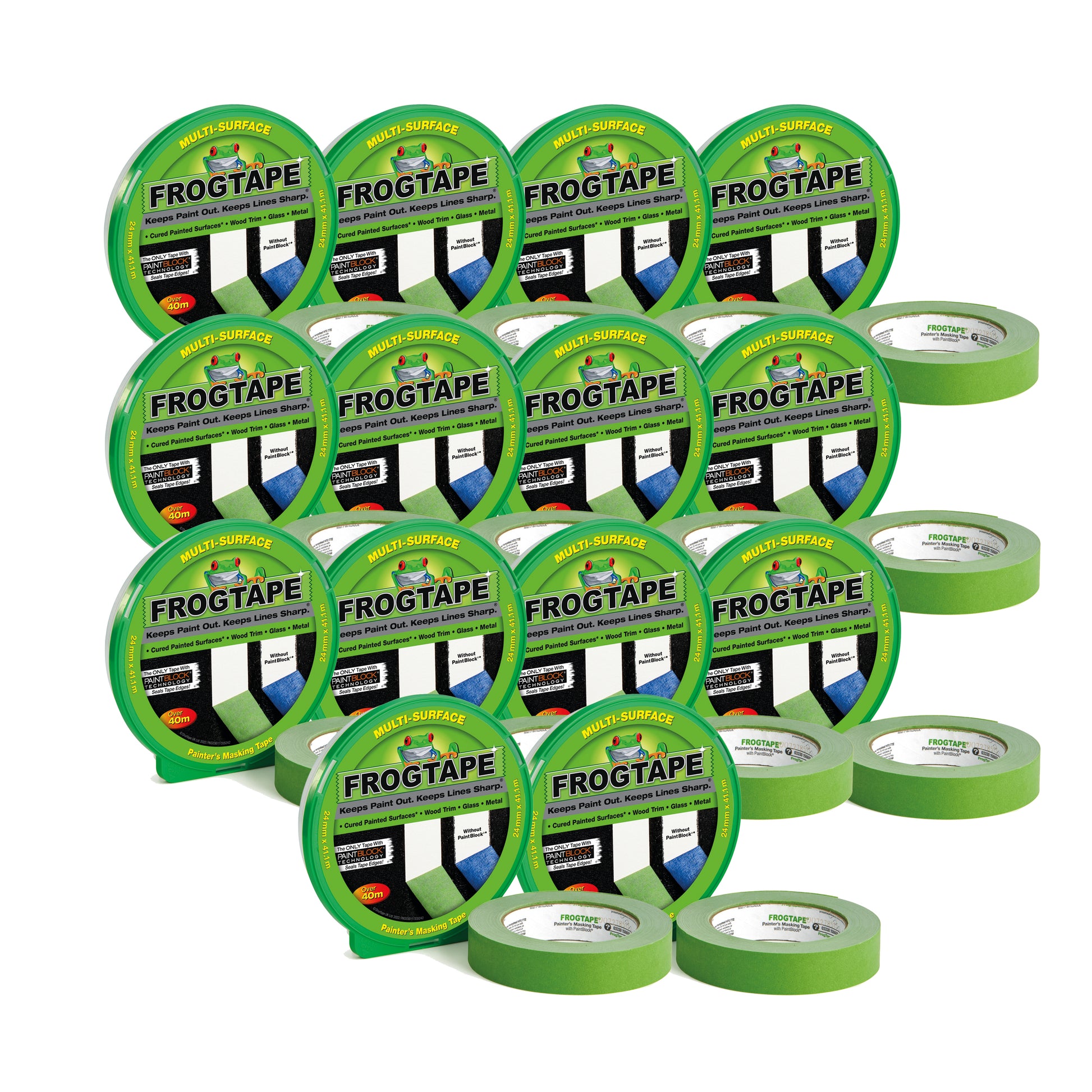 FrogTape Multi-Surface Masking Tape 24mmx41.1m Green (Pack of 14) 157361. Premium grade. PaintBlock Technology. For use on cured painted walls, wood trim, glass, metal and stone. Tape canister for clean, protected storage. Interior use. Medium adhesion.