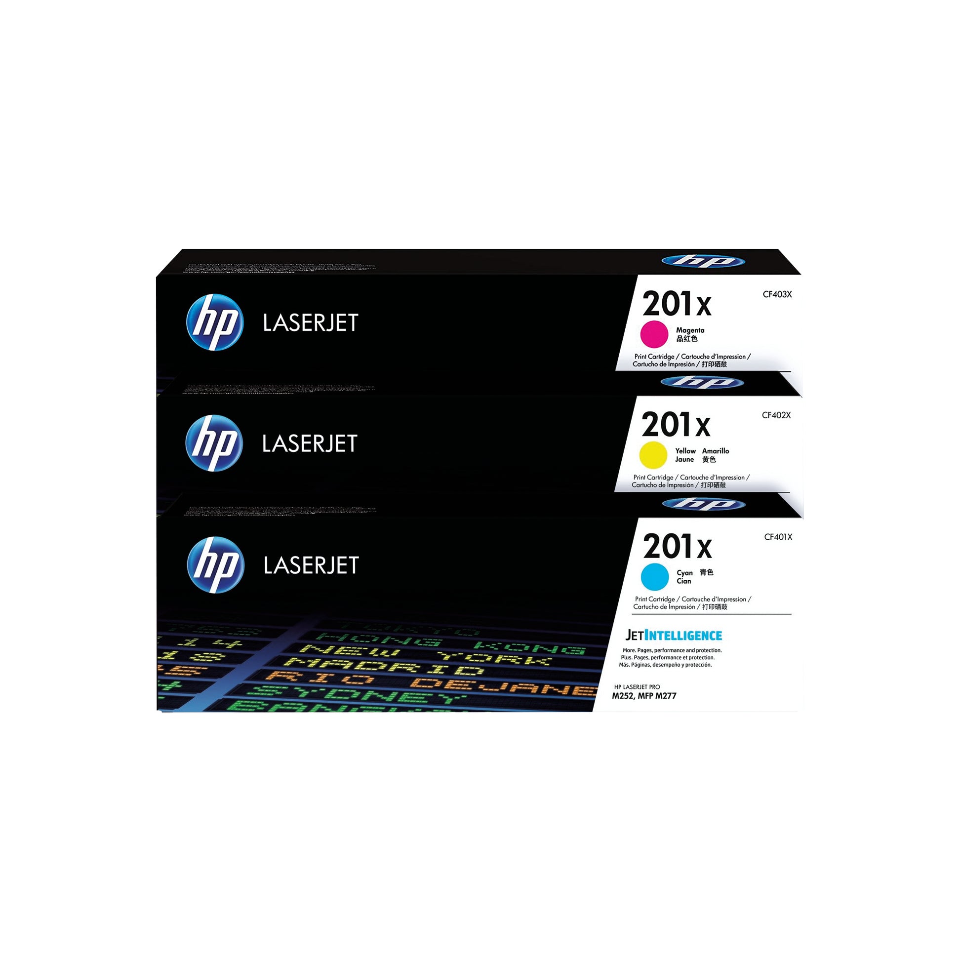 HP 201X High Yield Cyan Magenta Yellow Laserjet Toner Cartridge (Pack of 3) CF253XM. Colour: CMY. Page Yield: 2300 Pages per cartridge. For use with HP Colour LaserJet Pro M252/MFP M277 series printers.