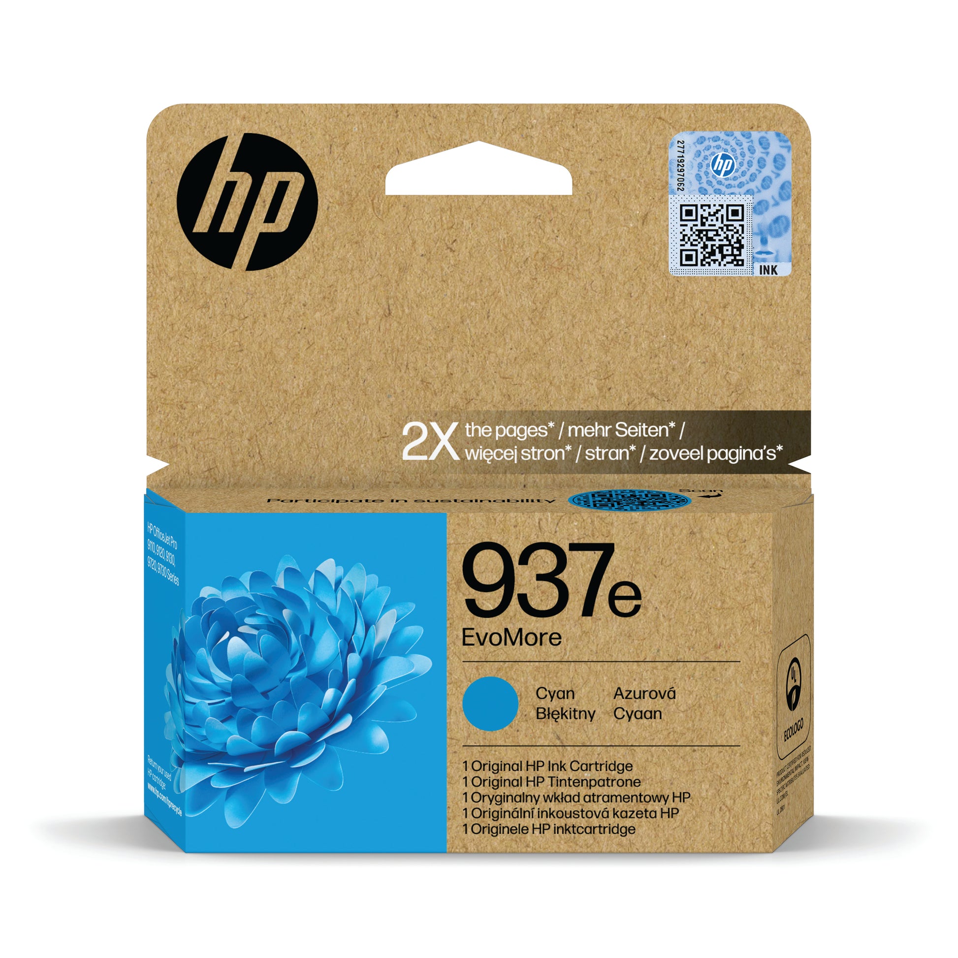 HP 937E EvoMore Ink Cartridge High Yield Cyan 4S6W6NE. Page yield: up to 1,650. Compatible with: HP Officejet Pro 9110, 9110b, 9120, 9120b, 9122e, 9125e, 9130, 9130b, 9135e, 9720, 9720e, 9730, 9730e. Inkjet cartridge.