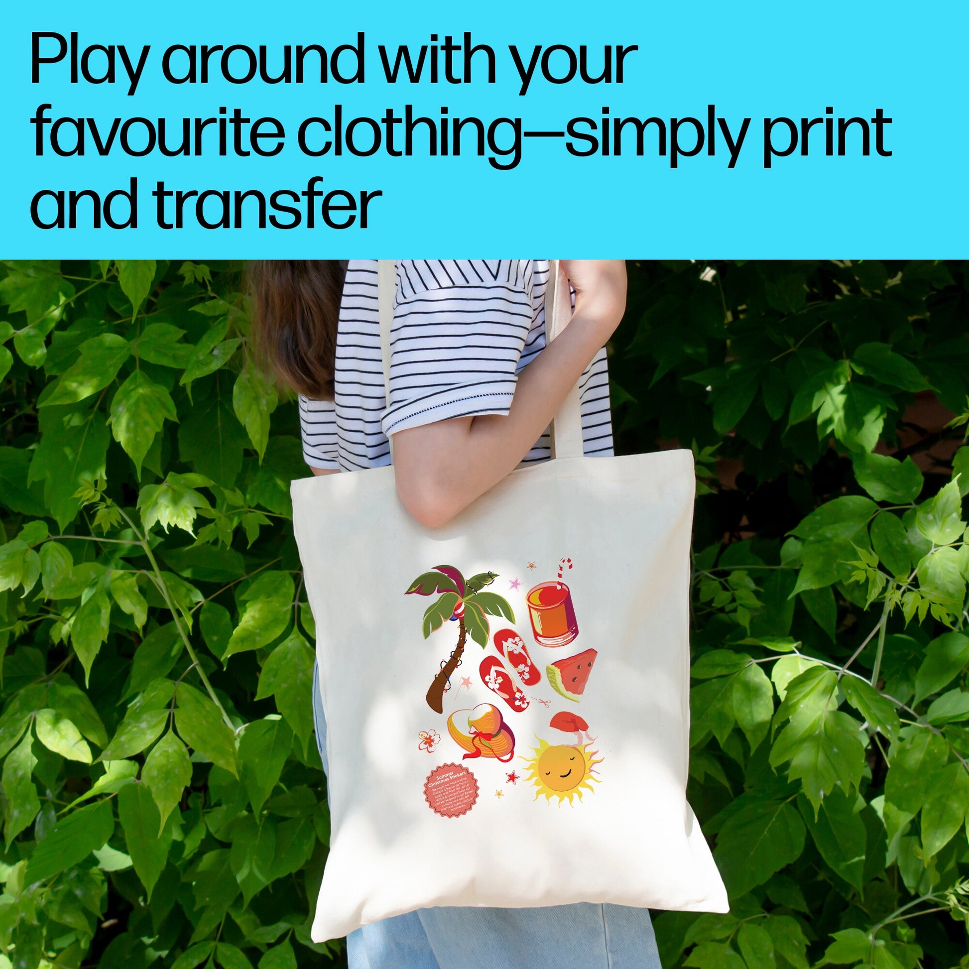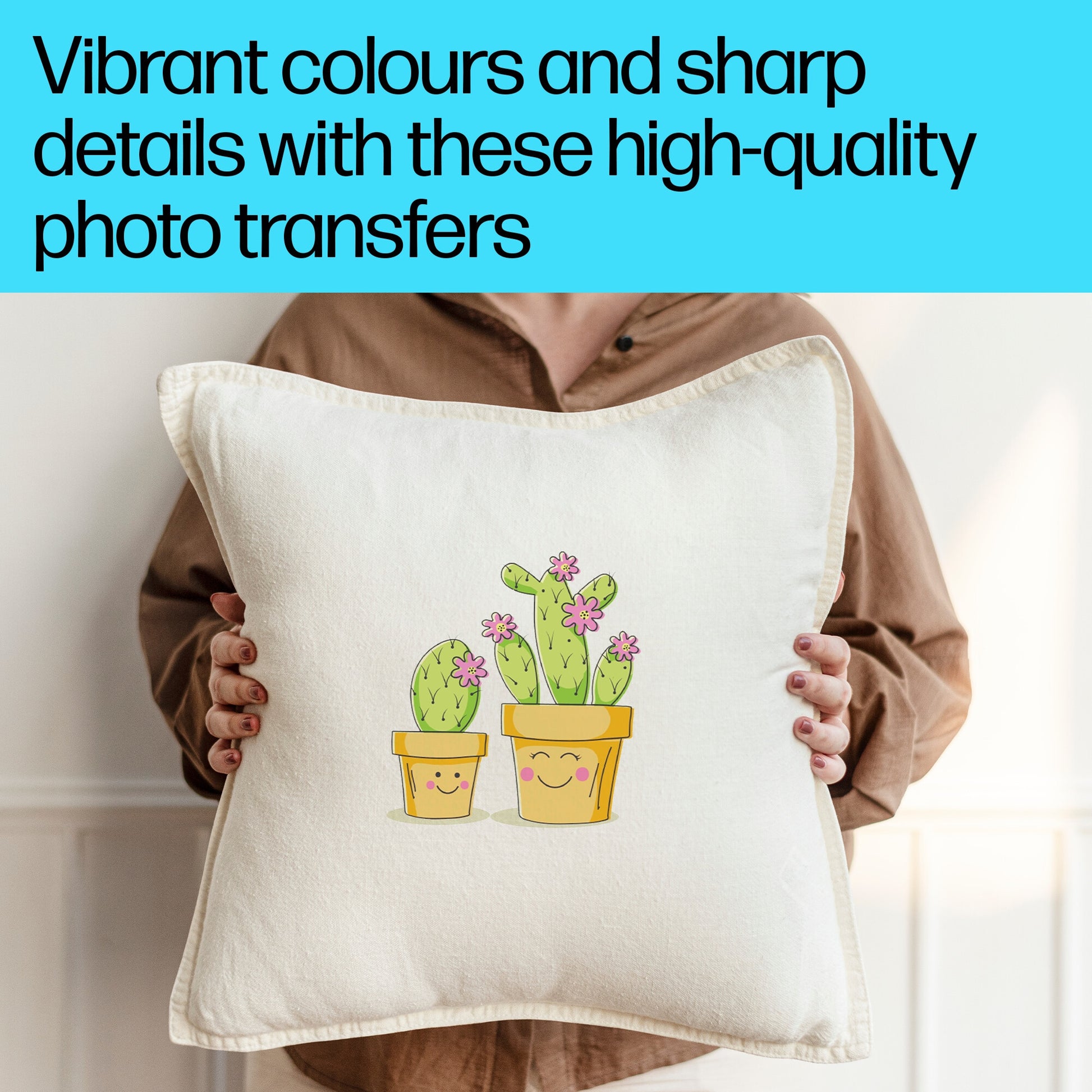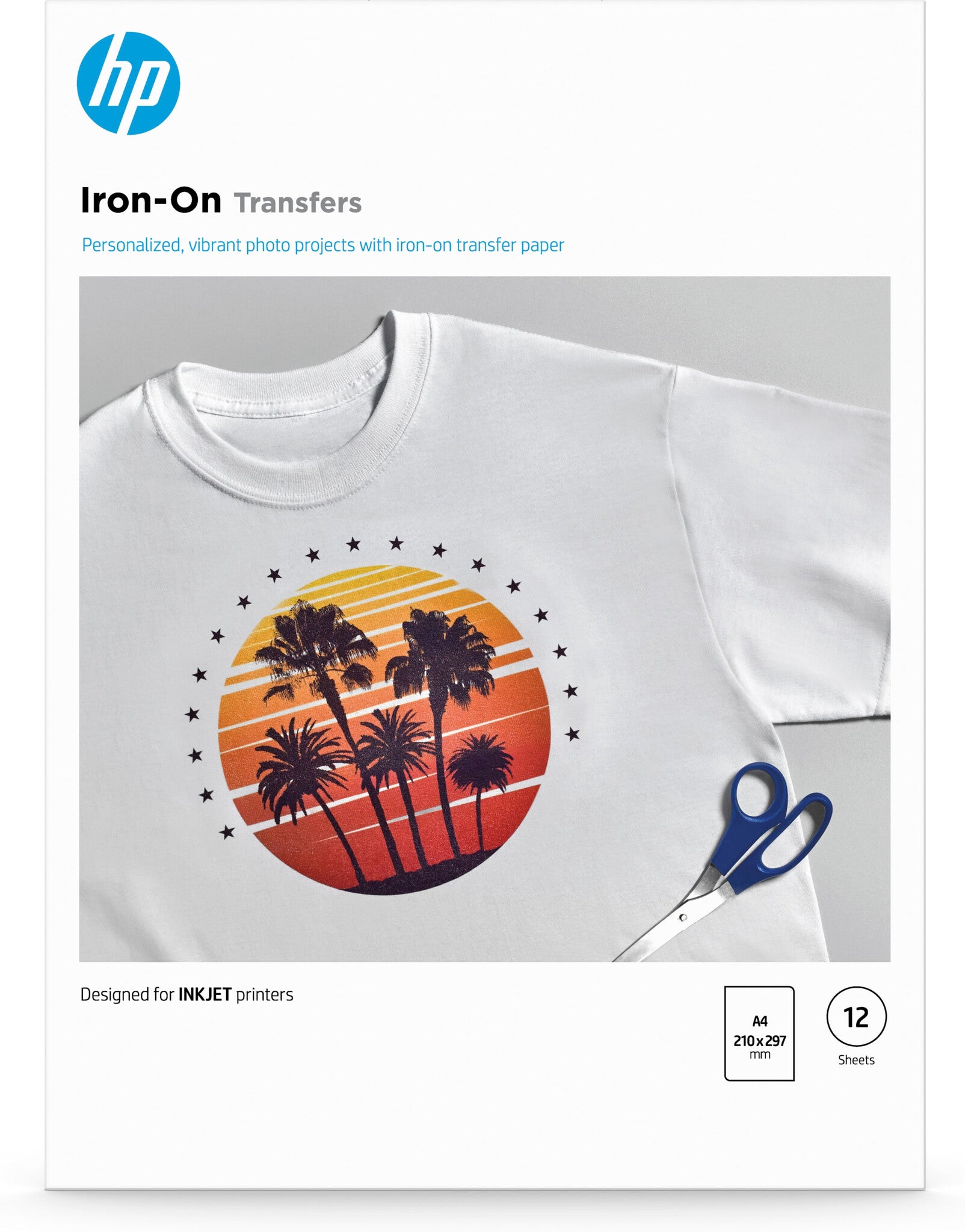 HP Iron-on Transfers are suitable for cotton or cotton/poly blend fabrics. These iron-on, cool-peel inkjet transfers are specially designed to produce vivid colour images and graphics on white or light-coloured fabrics.