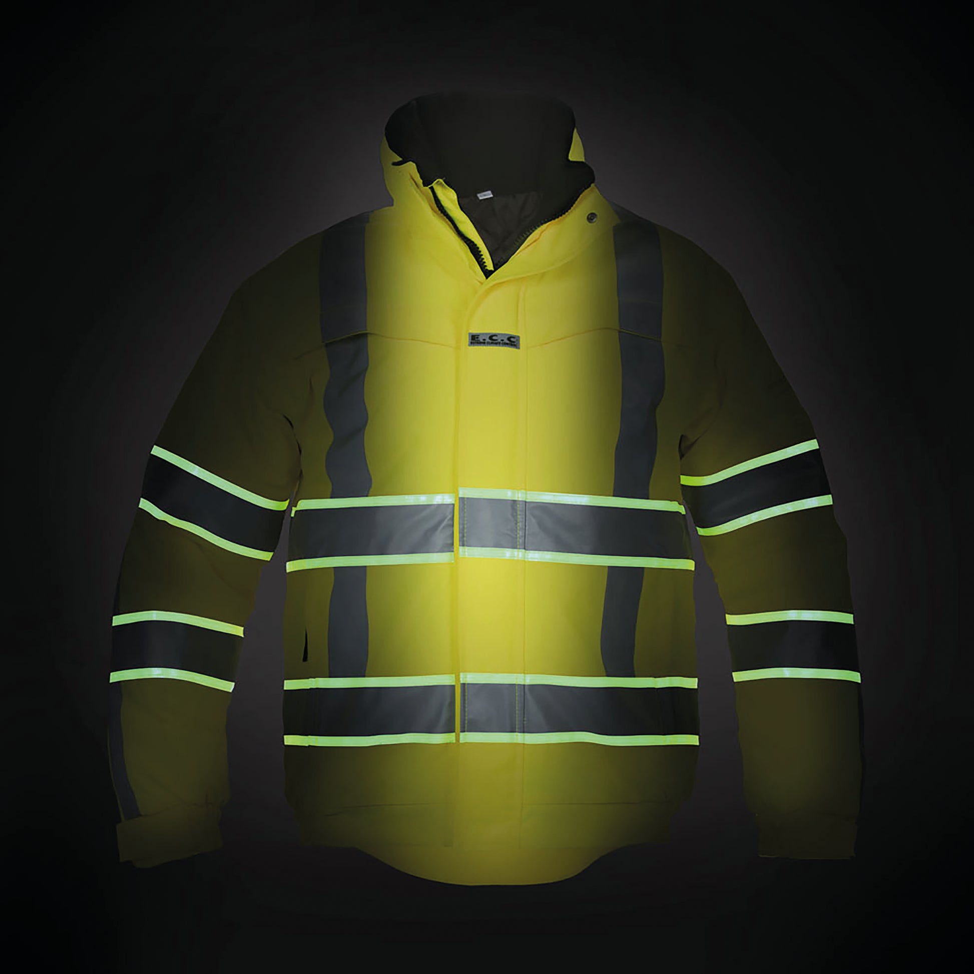 Hydrowear India High Visibility Pilot Jacket + Glow in the Dark GIS Tape. Concealed zip front, double storm flap cover, press stud closure. Fixed quilted lining, hood in collar. Range of pockets. Adjustable cuffs and adjustable extended back.