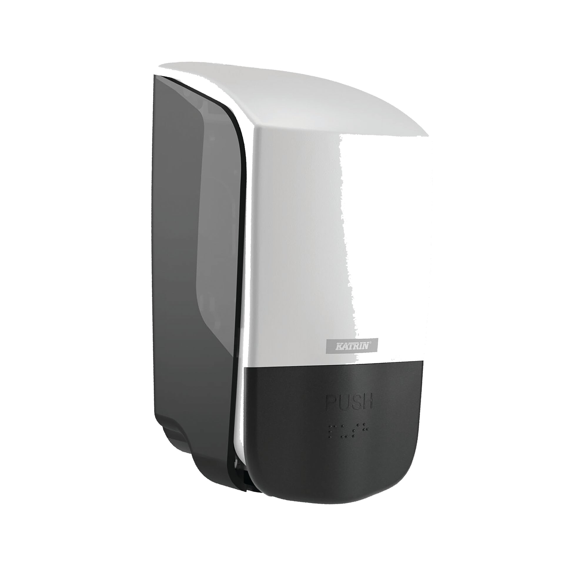 Katrin Soap Dispenser 500ml White 77335. Compatible with Katrin 500ml liquid soap, foam soap, sanitizer and shower gel cartridges. Push front for easy use. Braille instructions on outer. Easy to refill with soap cartridge system.