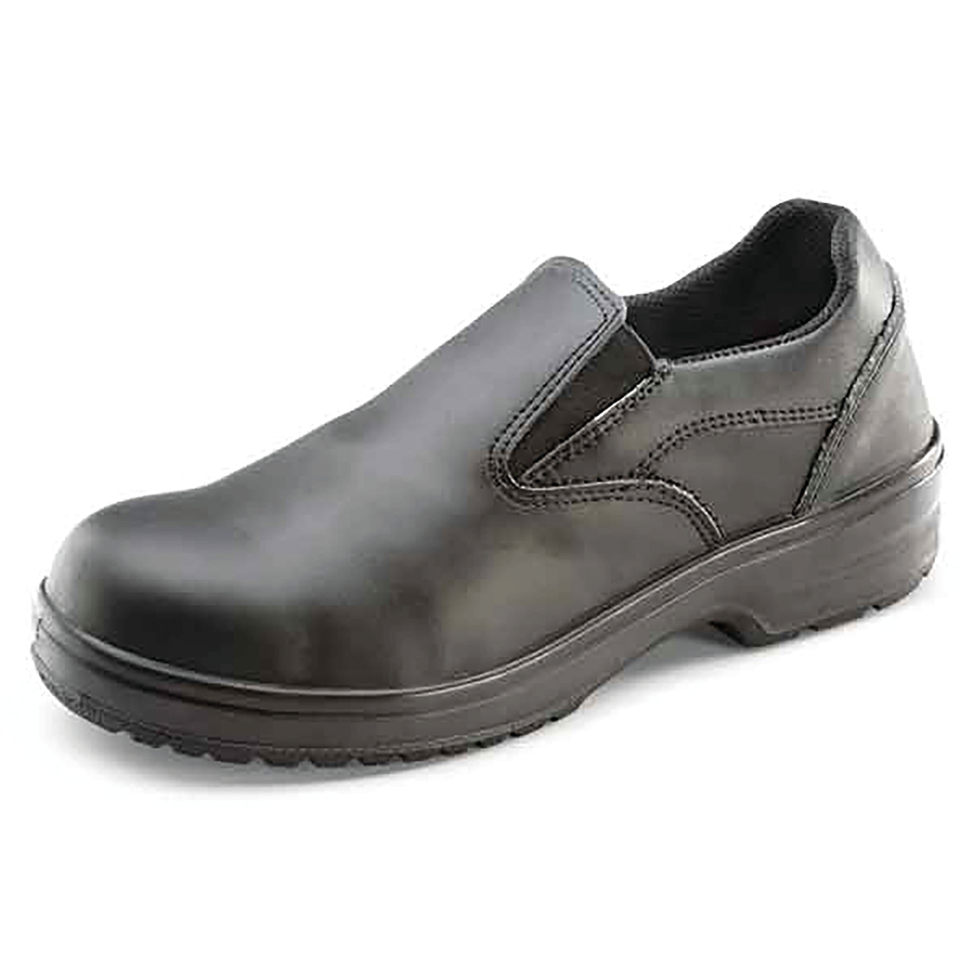 Beeswift Ladies Dual density S1 slip on shoe. With 200 Joule steel toe cap and steel midsole protection. Shock absorber heel and anti-static outsole. Slip resistant for extra grip. Leather uppers with two elasticated vents for extra flexibility.