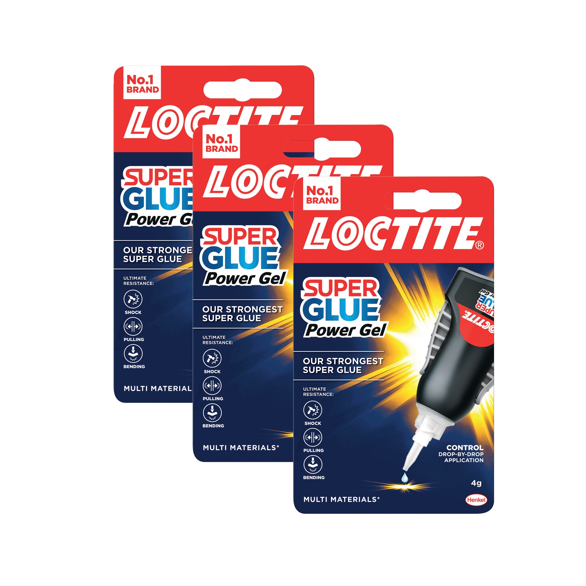 Loctite Super Glue Power Gel 4g 3 for 2. Water, dishwasher, shock and temperature resistant rubber-infused gel super glue. Easy grip squeeze bottle allows controlled application. Lift-and-lock safety cap with anti-clog design.