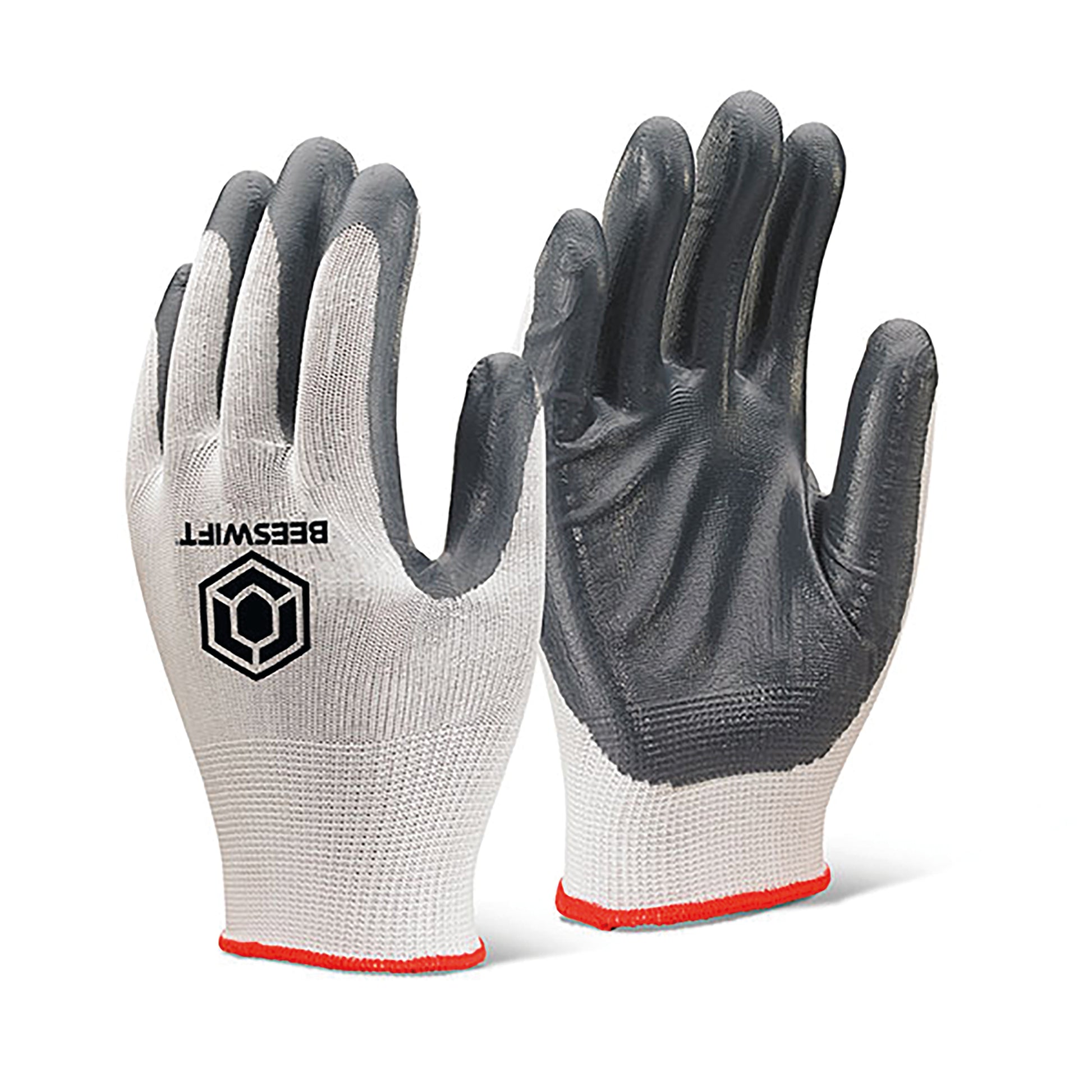 Beeswift Nitrile P/C Polyester Gloves. 35% polyester/65% Nitrile. Nitrile coated palm and fingers. Ventilated back. Lightweight for maximum dexterity and comfort with sensitivity. Suitable for general assembly handling and light engineering.Pack of 10.