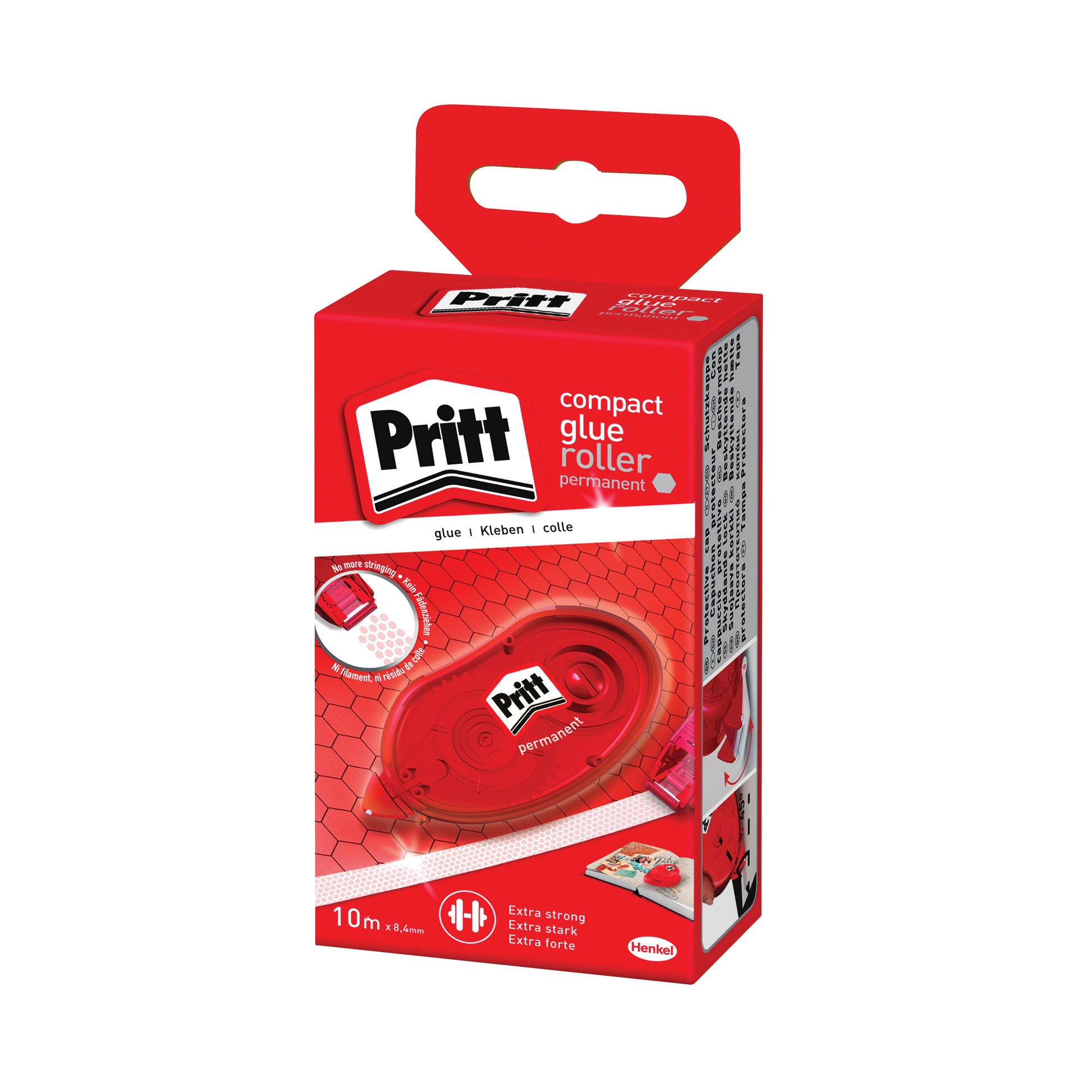 Pritt Permanent Glue Roller Compact 8.4mm x 10m (10 Pack) 2120601. Disposable glue roller for fast and clean glue application. Dries instantly for immediate bonding. Wind up mechanism with tightening screw to prevent slack.
