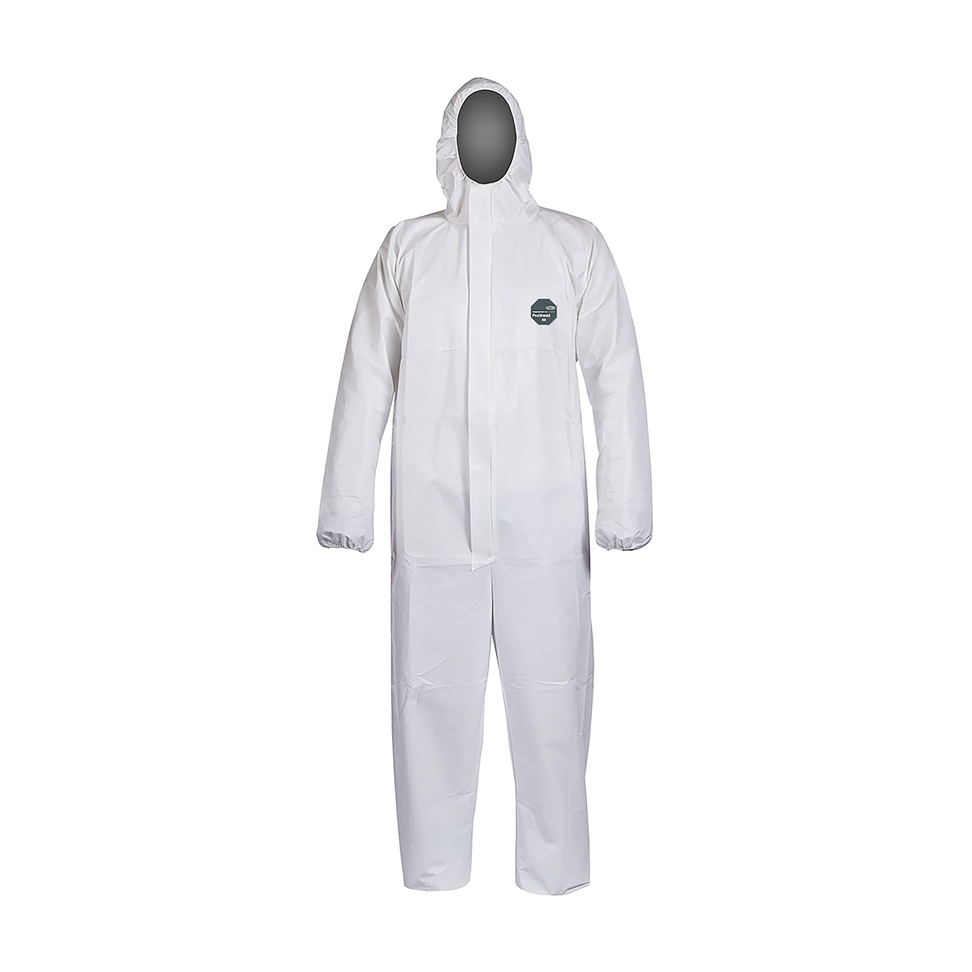 Dupont ProShield 60 Disposable Coverall. Hooded Coverall with zipped closure/flap. Elasticated wrists, ankles and face for protection. Conforms to: CAT III EN ISO 13982-1:2004 + A1:2010 EN 13034:2005 + A1:2009 EN 1073-2:2002 EN 1149-5:2018 (on inside).