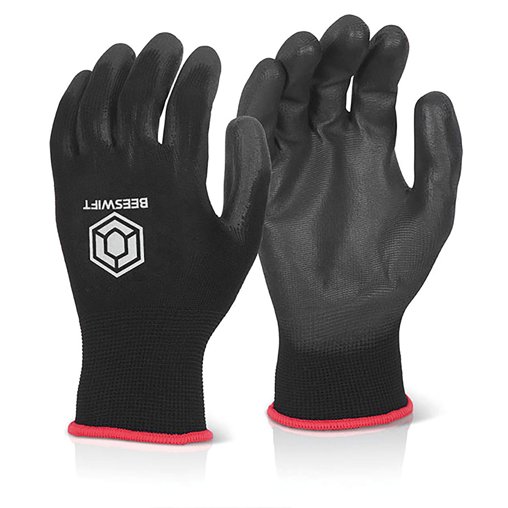 Beeswift PU Coated Gloves Black. 35% polyester/65% PU. PU coated palm. Machine knitted. Integrated elasticated wrist. EN388:2016 L4 Abrasion. LX Cut Resistance. L2 Tear Resistance. L1 Puncture. EN388: 2016 Level A - ISO 13997 Cut Resistance. Pack of 10.