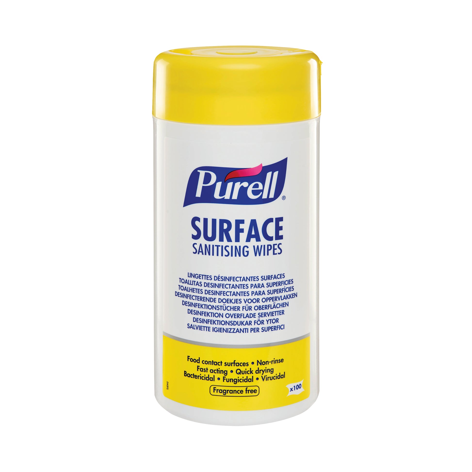 Purell Surface Sanitising Wipes. Suitable for use on food contact surfaces with no rinsing required after use. Fact acting and drying. Bactericidal, fungicidal and mycobactericidal. Pack of 100.