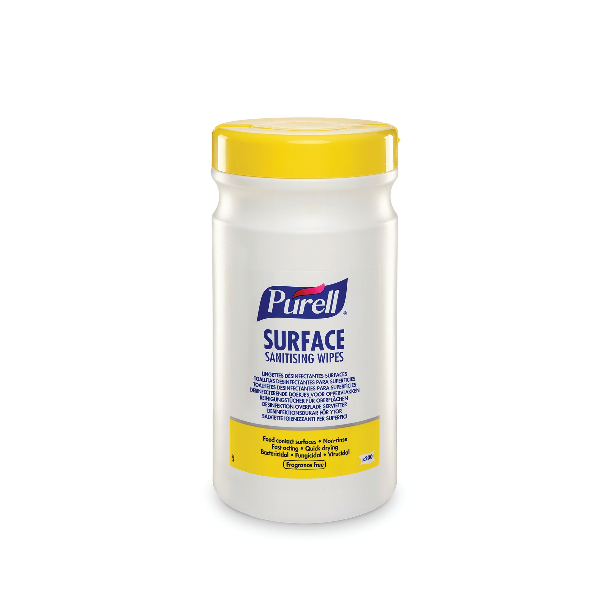 Purell Surface Sanitising Wipes. Suitable for use on food contact surfaces with no rinsing required after use. Fact acting and drying. Bactericidal, fungicidal and mycobactericidal. Pack of 200.