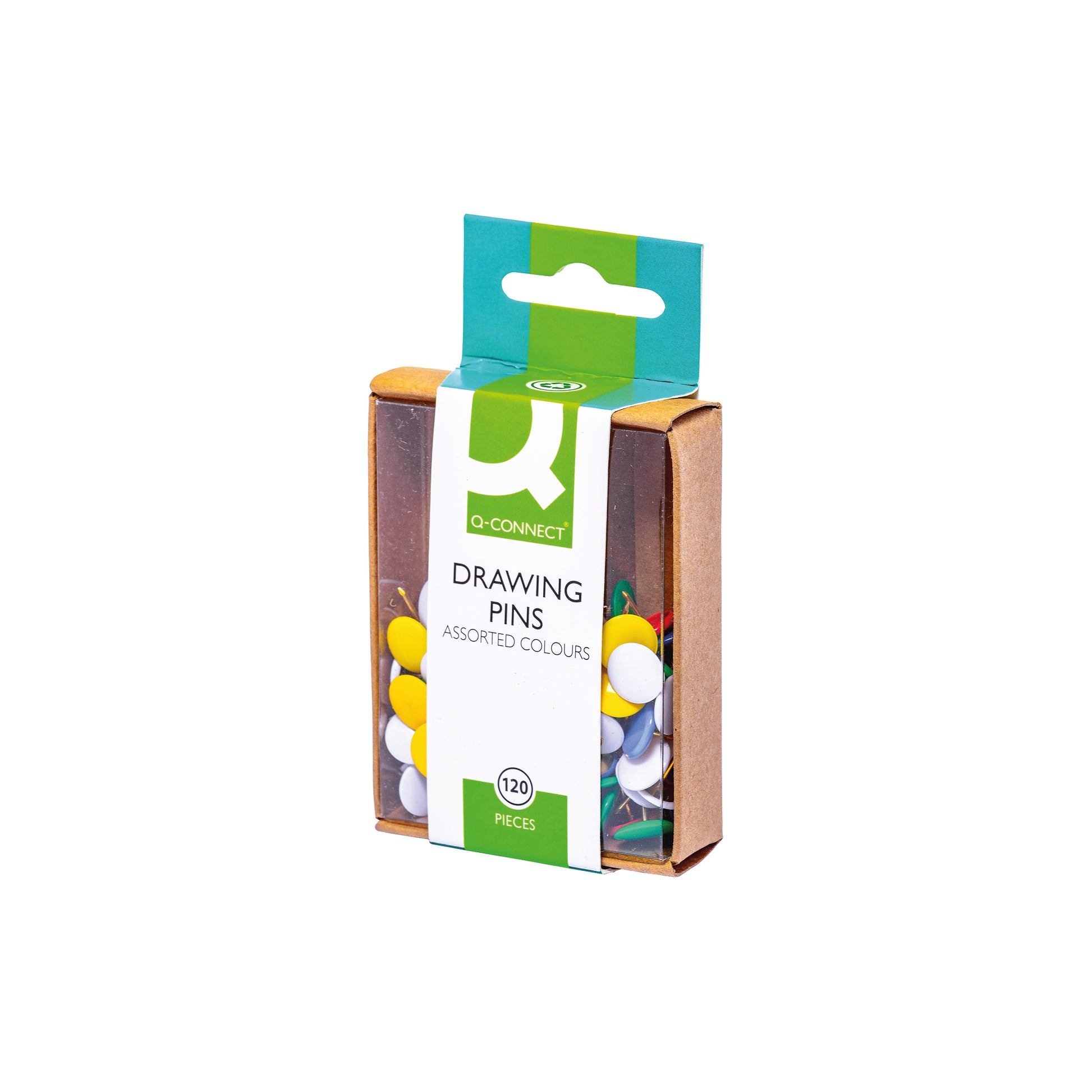 Drawing pins for home and office use. Solid head is strong and durable. Convenient hanging packs for storage. Assorted colours. 120 pins per pack. Pack of 10.