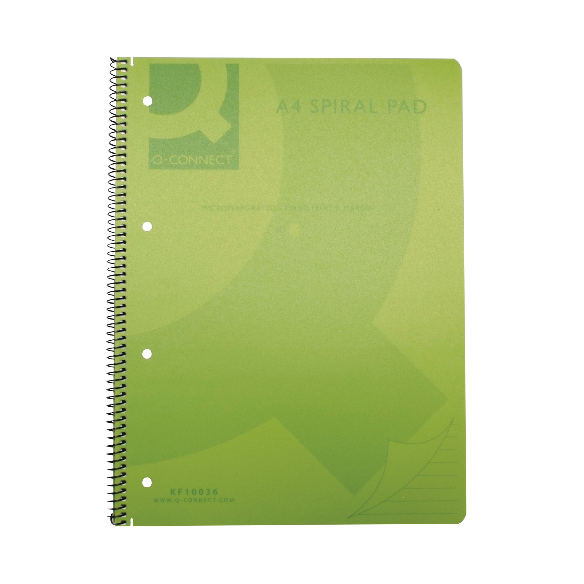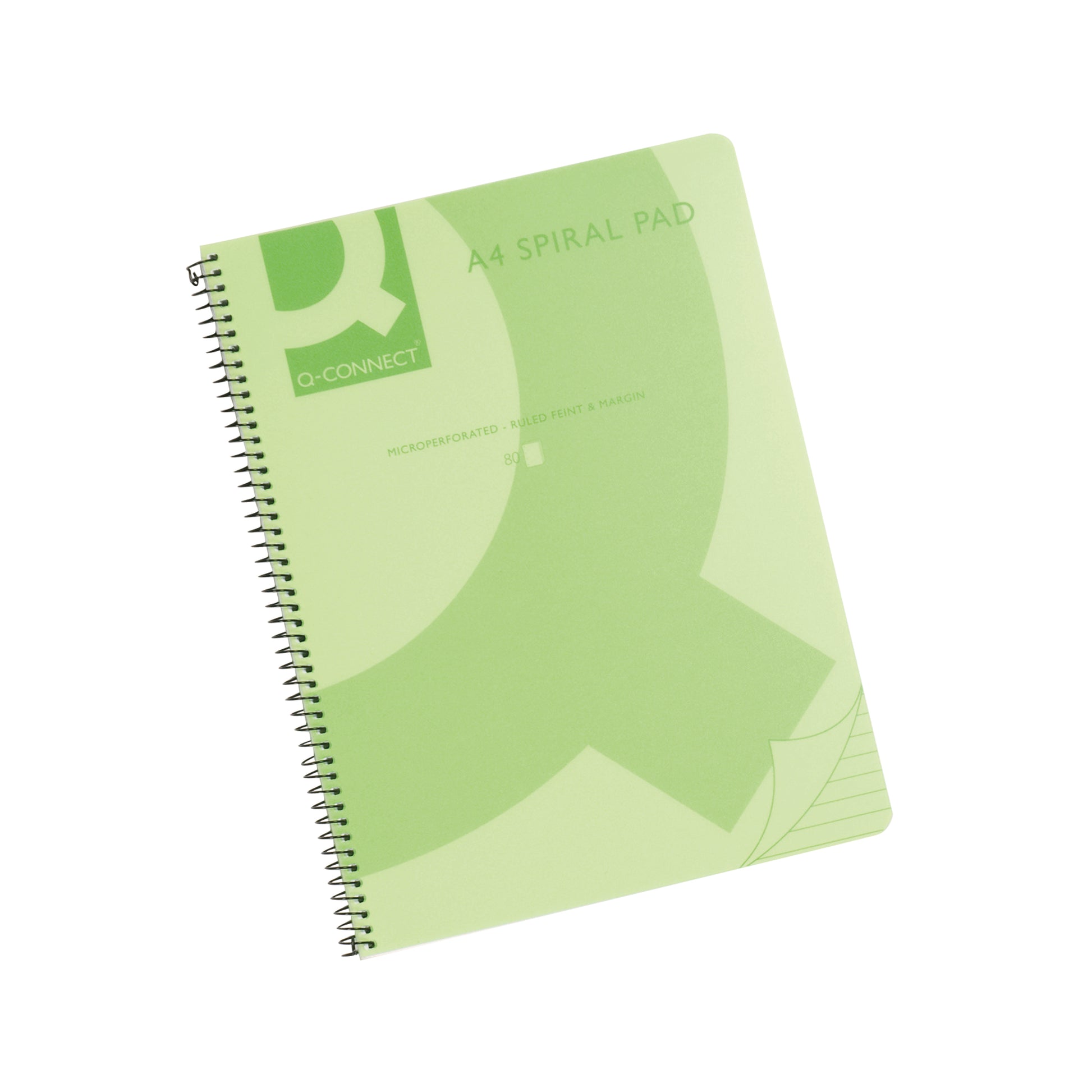 Q-Connect polypropylene A4 notebook. Brightly coloured square cornered note pads with 160 pages of 70gsm woodfree paper. Sheets are ruled feint and margin. Green.