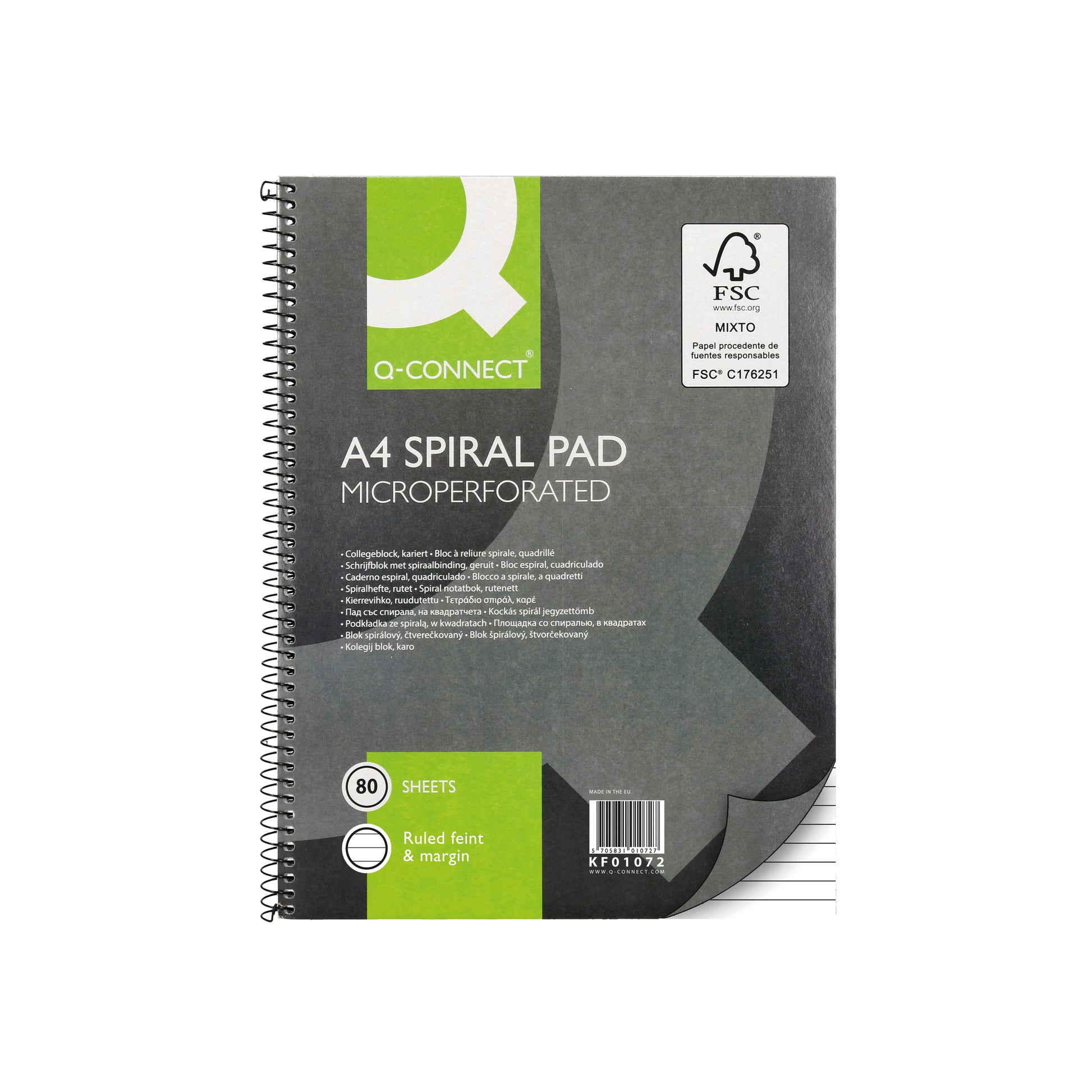 Q-Connect A4 Spiral Bound Notepad constructed over a rigid back board with micro-perforations for easy removal of sheets. Pre-punched with 4 holes for easy filing. Each pad contains 160 pages of quality White wove paper ruled feint and margin.