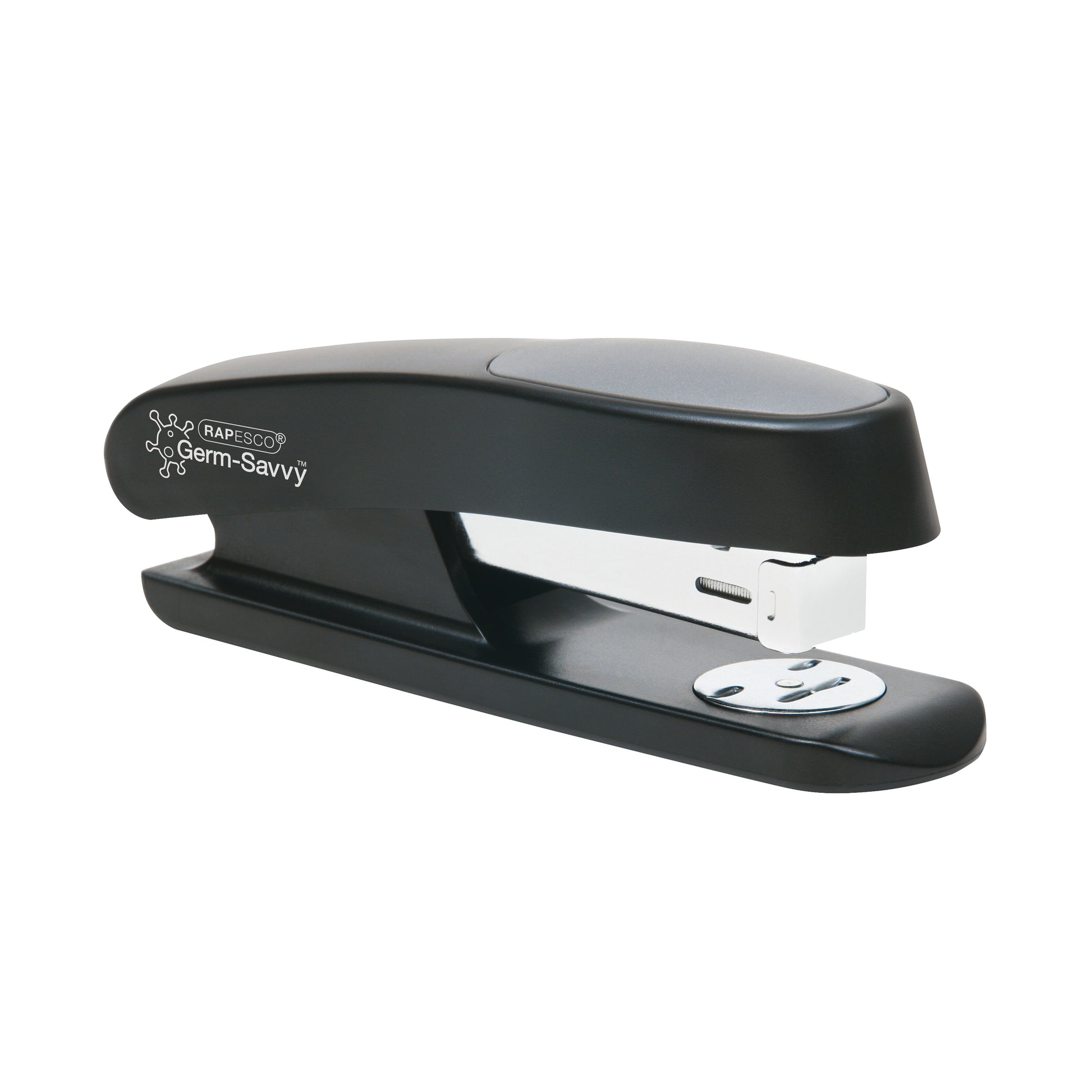 Rapesco Office Stapler R7. Modern design with unique soft rubber top cap. Full rubber base and staple refill indicator. Loads half strips. Throat depth 65mm. Capacity 20 sheets of 80gsm paper. Colour - Black.