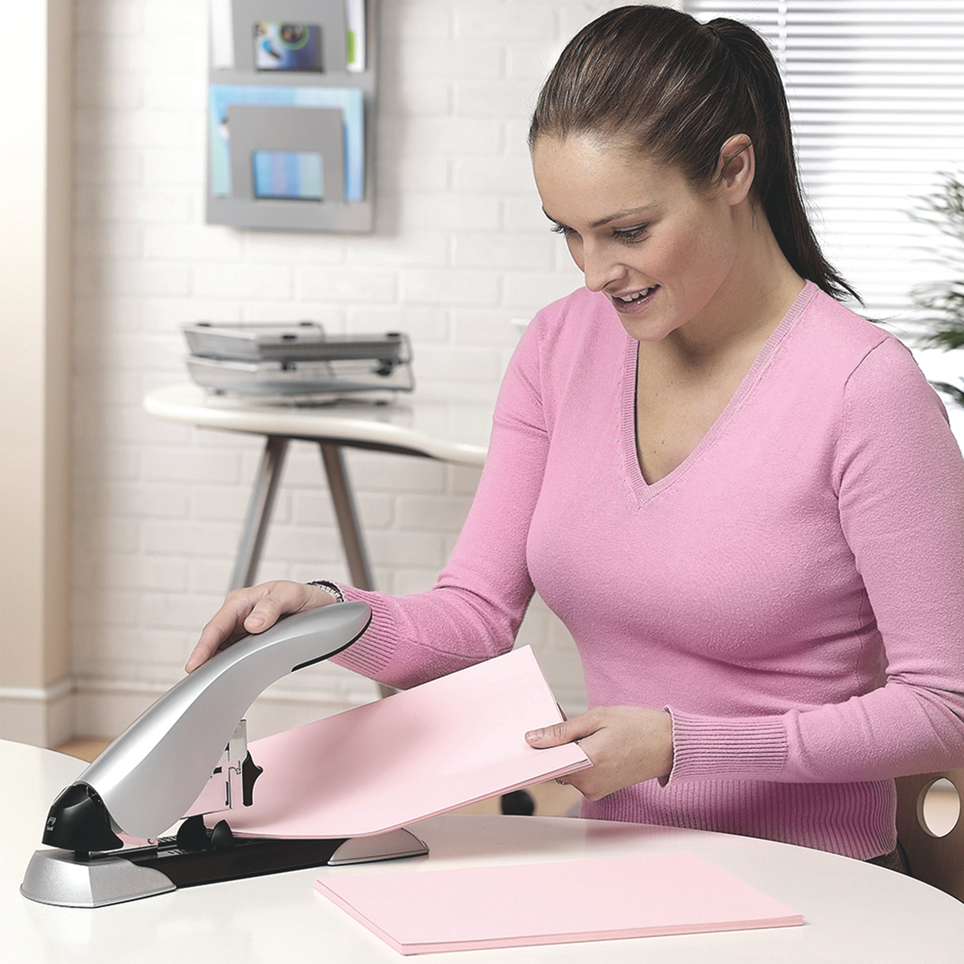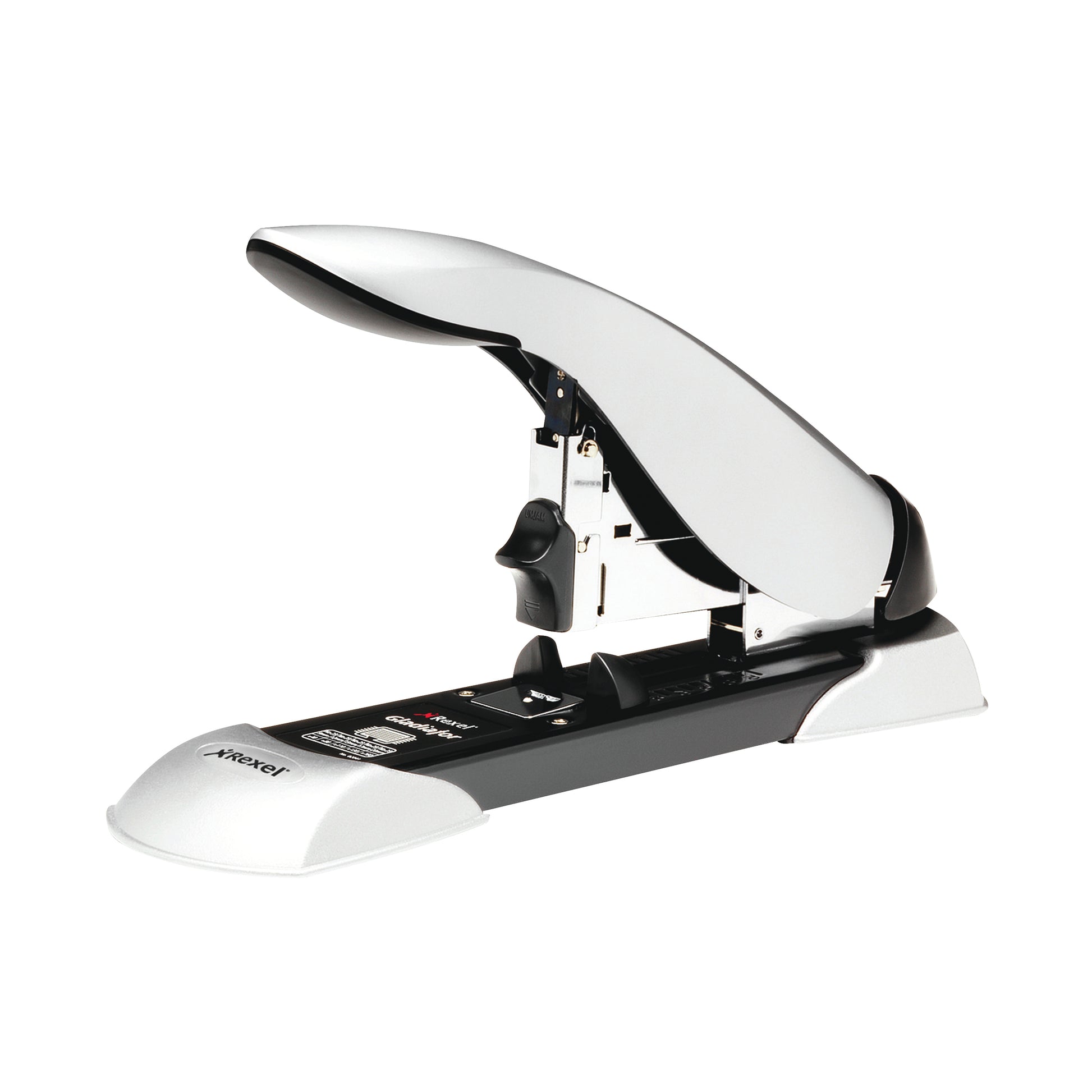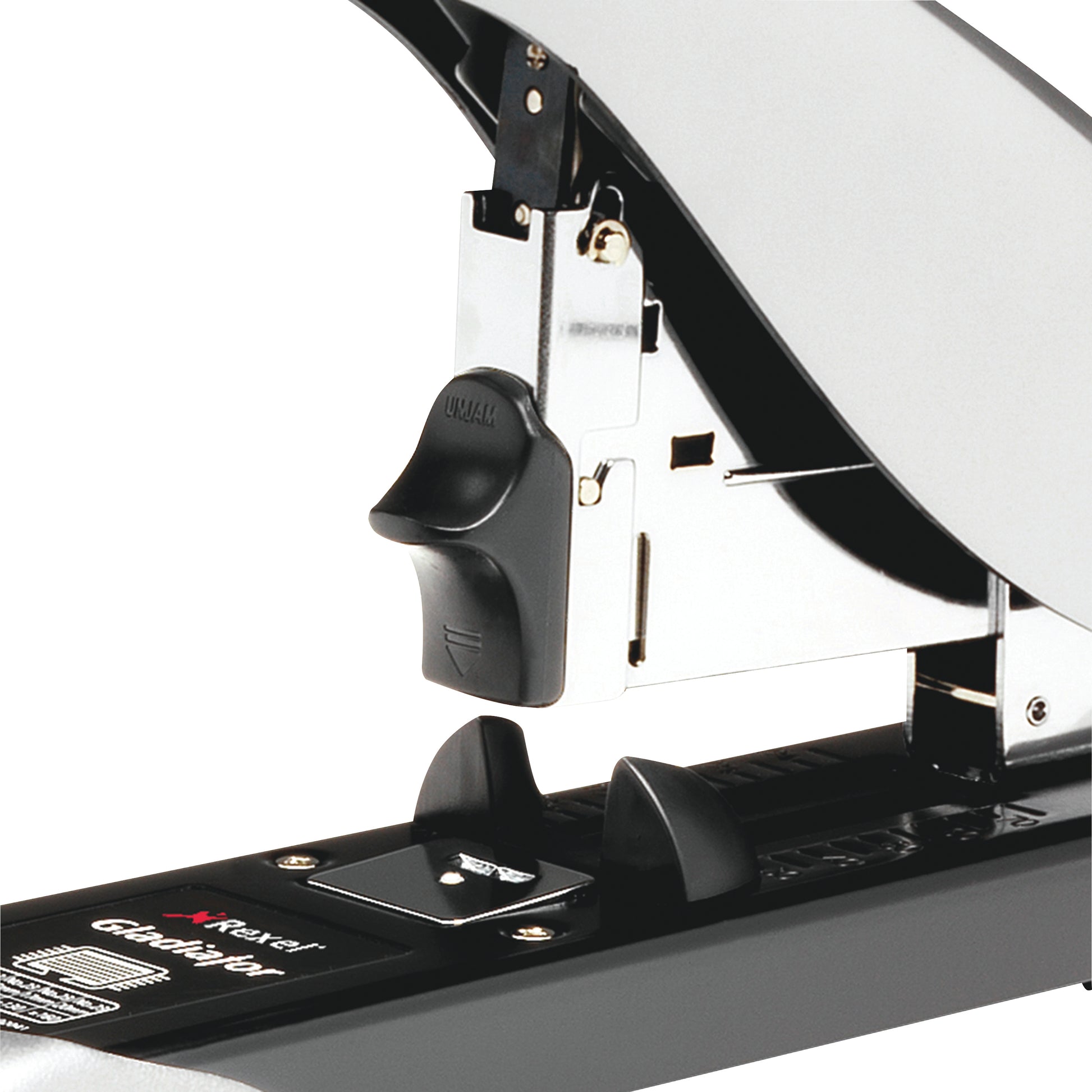 Rexel Gladiator Heavy Duty Stapler Silver/Black 2100591. Staples up to 160 sheets of 80gsm paper. All metal design. Staples are loaded into the base. Paper guide for accuracy. 10-70mm adjustable throat depth.