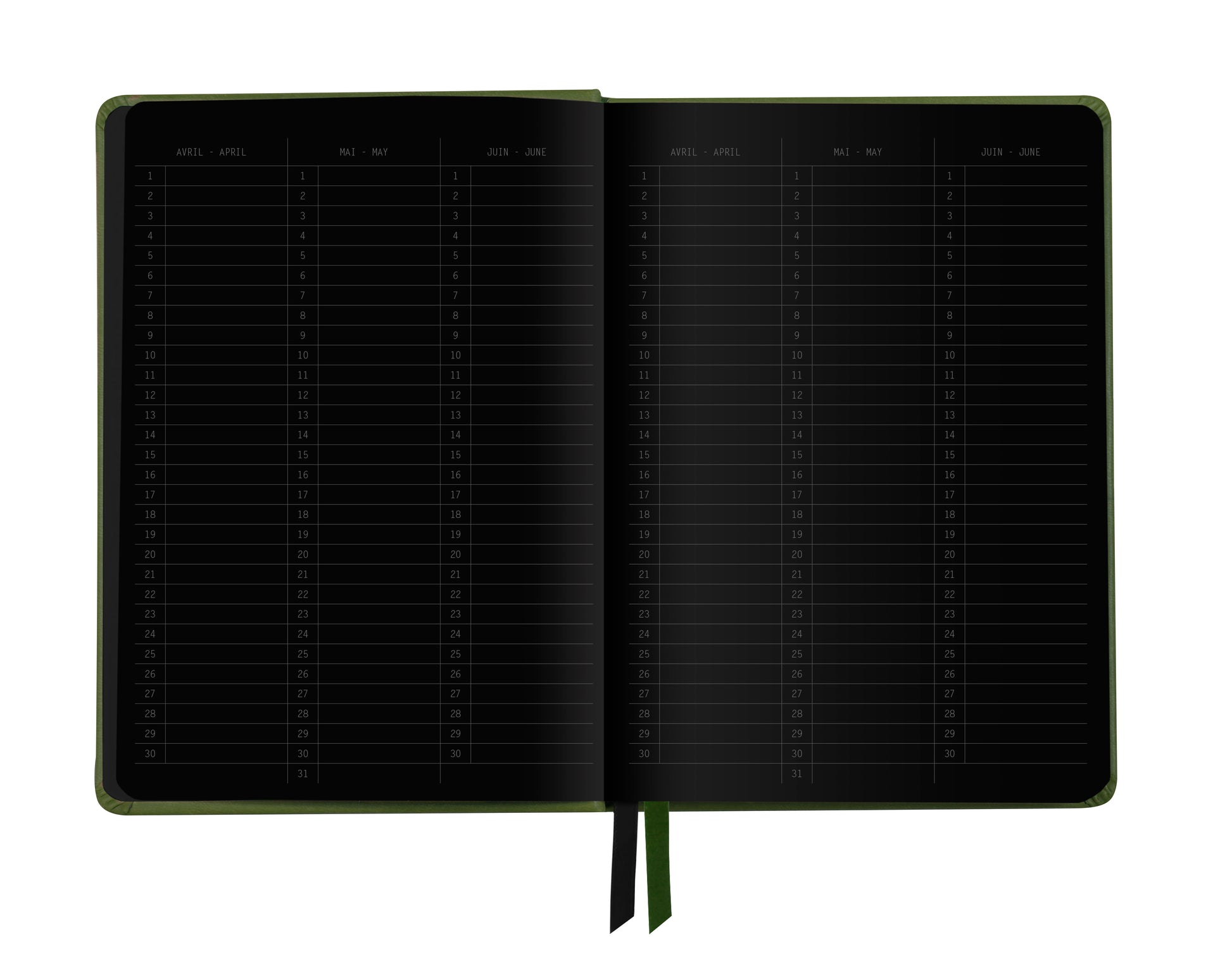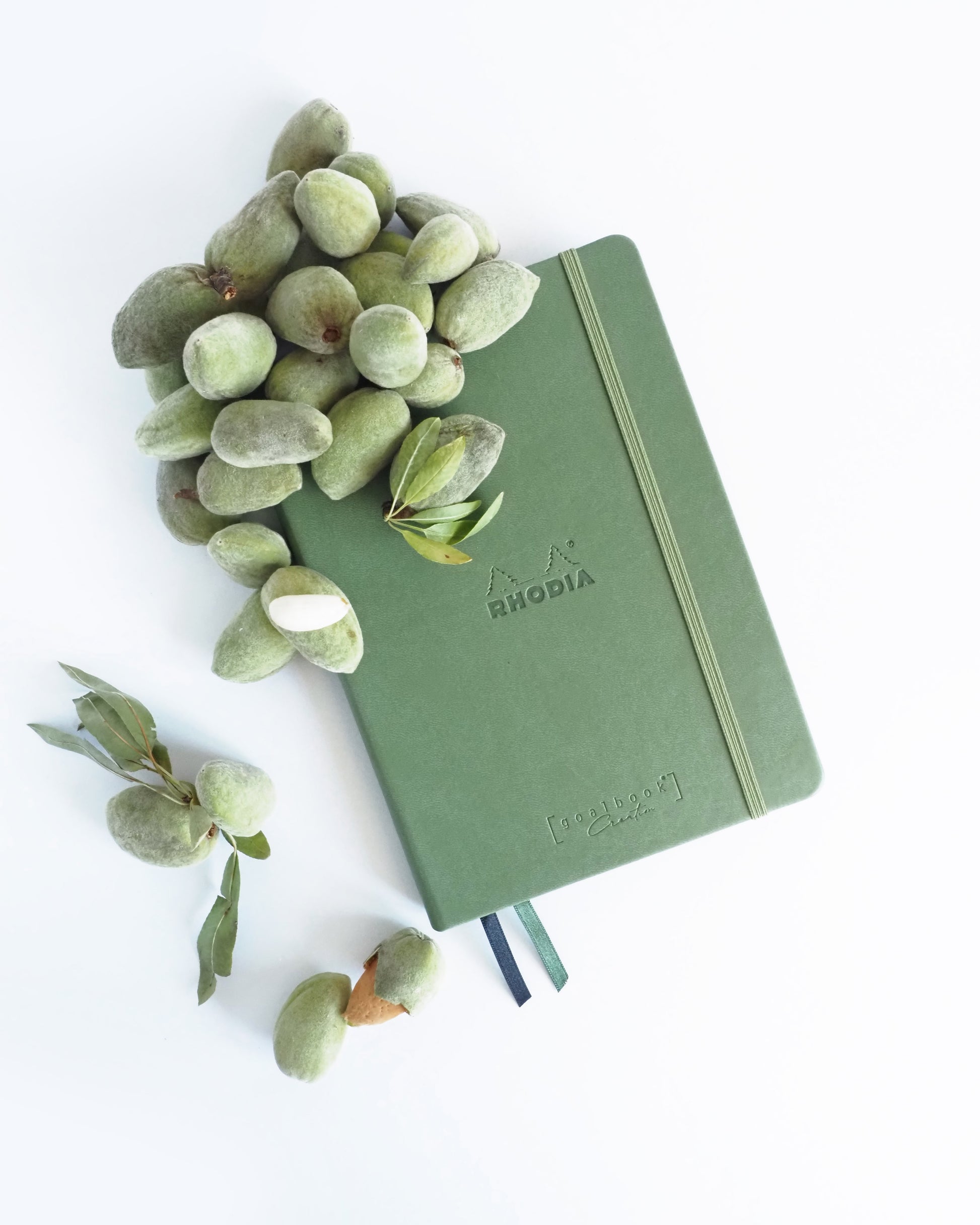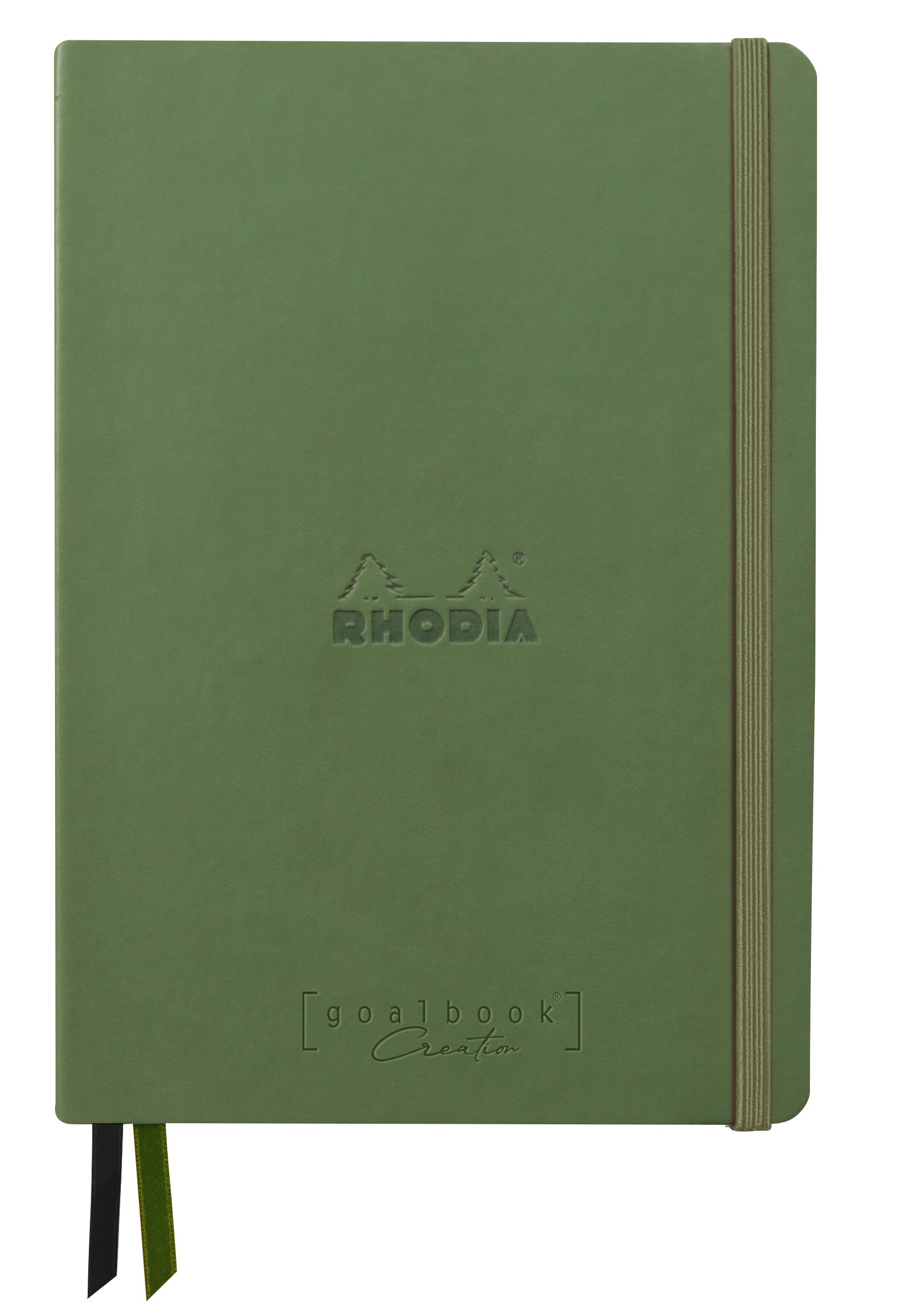 Clairefontaine Rhodiarama Creation Dot Goalbook A5 Sage 194445C. 160 pages (80 sheets). Hard cover backed in Italian leatherette. 6 Page index. Quality 120gsm numbered sheets of black Maya paper. Two perpetual calendars for organisation.