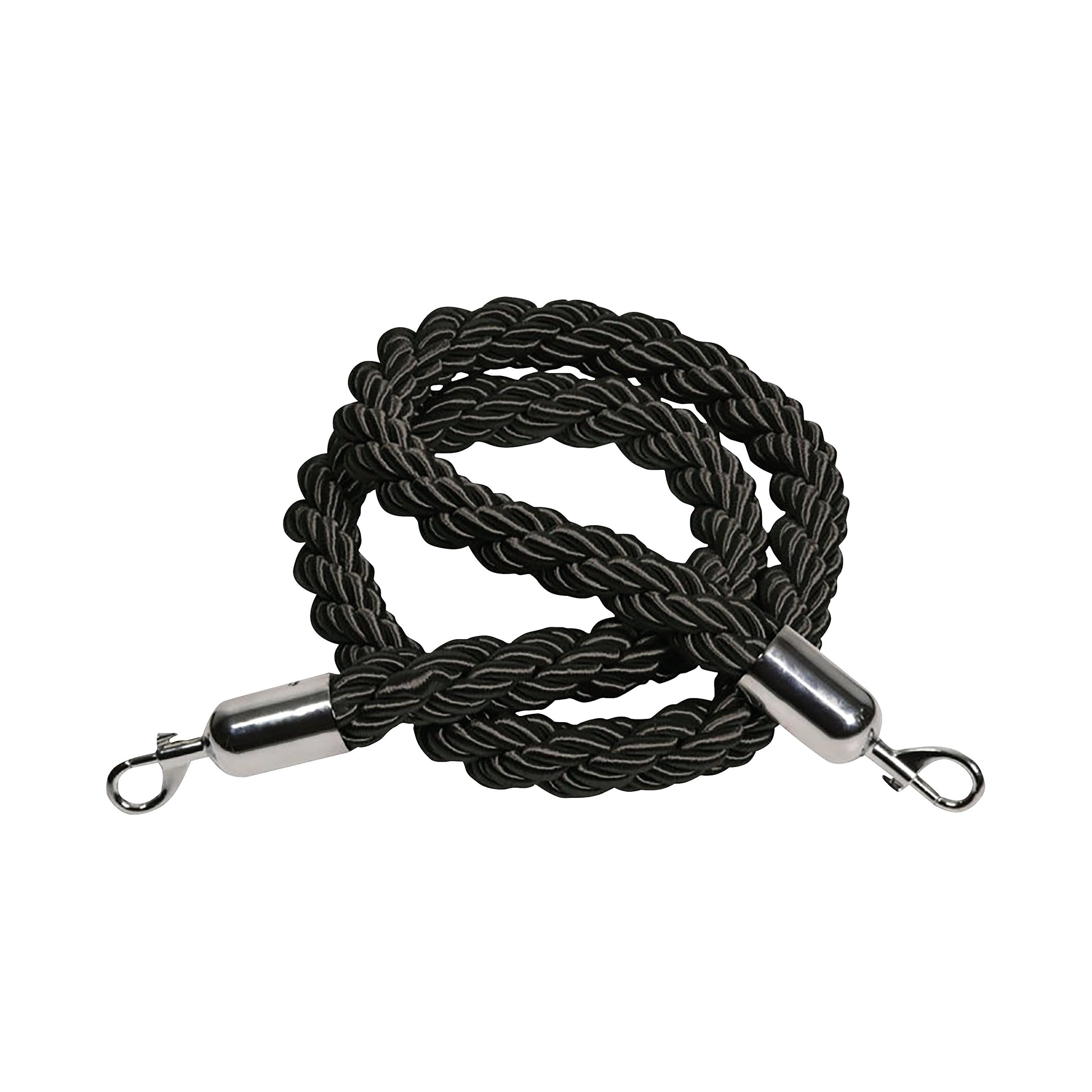 Rope 25x1500mm Black With Chrome Clips CBROPEBLACK. Rope with hooks fitted supplied in standard lengths 25mmx1500mm. For use with economy or classic rope stands. Black rope with chrome hooks.