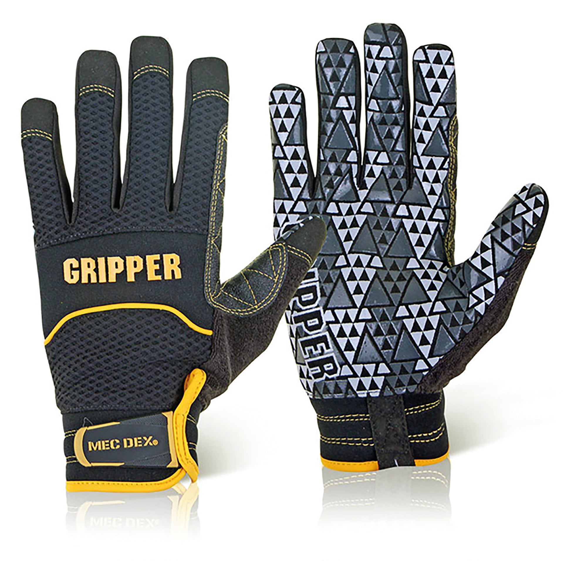 Mec DexRough Gripper Mechanics Gloves 1 Pair. Durable ventilating black meshed fabric. Silicon fused palm on synthetic leather provides excellent grip. Neoprene foam padding on the back protects the knuckles. Suitable for heavy assembling/power tool use.