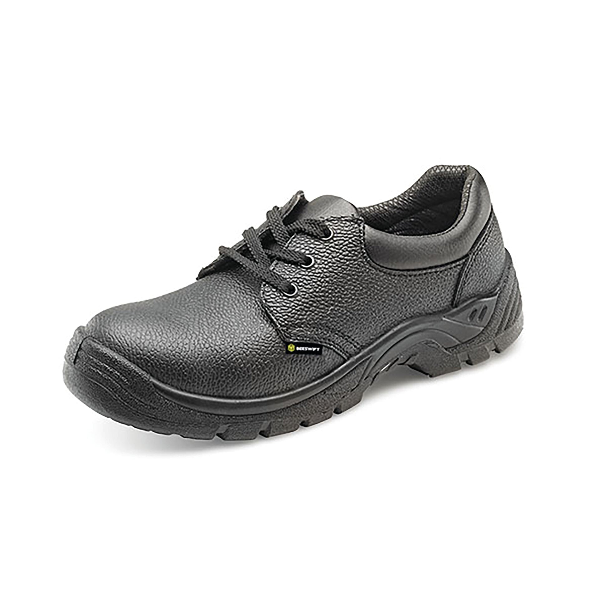 Beeswift safety shoe with 200 Joule steel toe cap and midsole protection. Durable anti-static PU outsole. Energy absorber heel. Anti-static outsole. Oil and slip resistant outsole. PU dual density with leather uppers and padded collar. Lace up fastening.