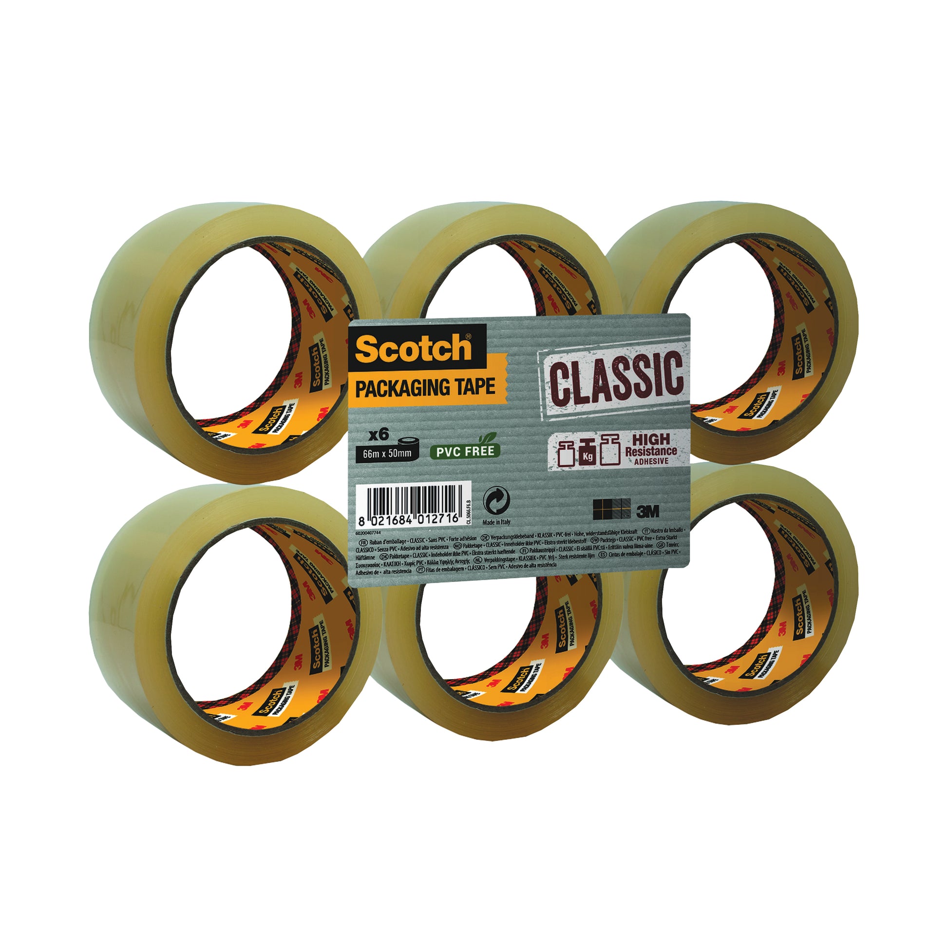 Scotch Polypropylene Packaging Tape. General purpose polypropylene tape with solvent free adhesive ideal for sealing rough parcels brown boxes or cartons for shipping. Size - 50mm x 66m. Colour - Clear.
