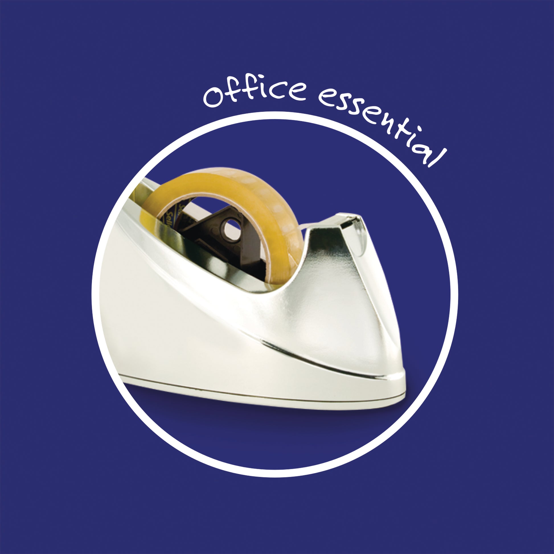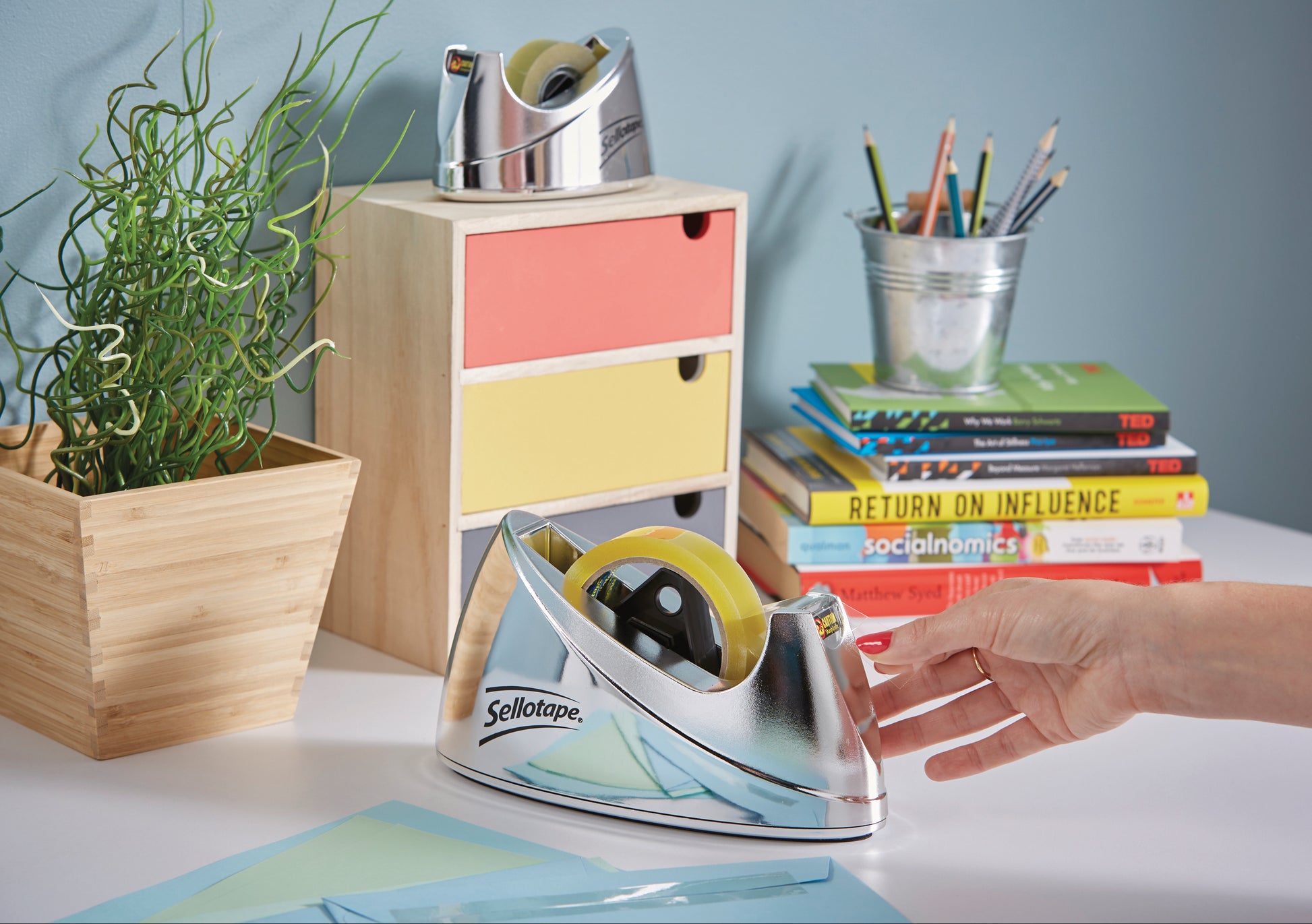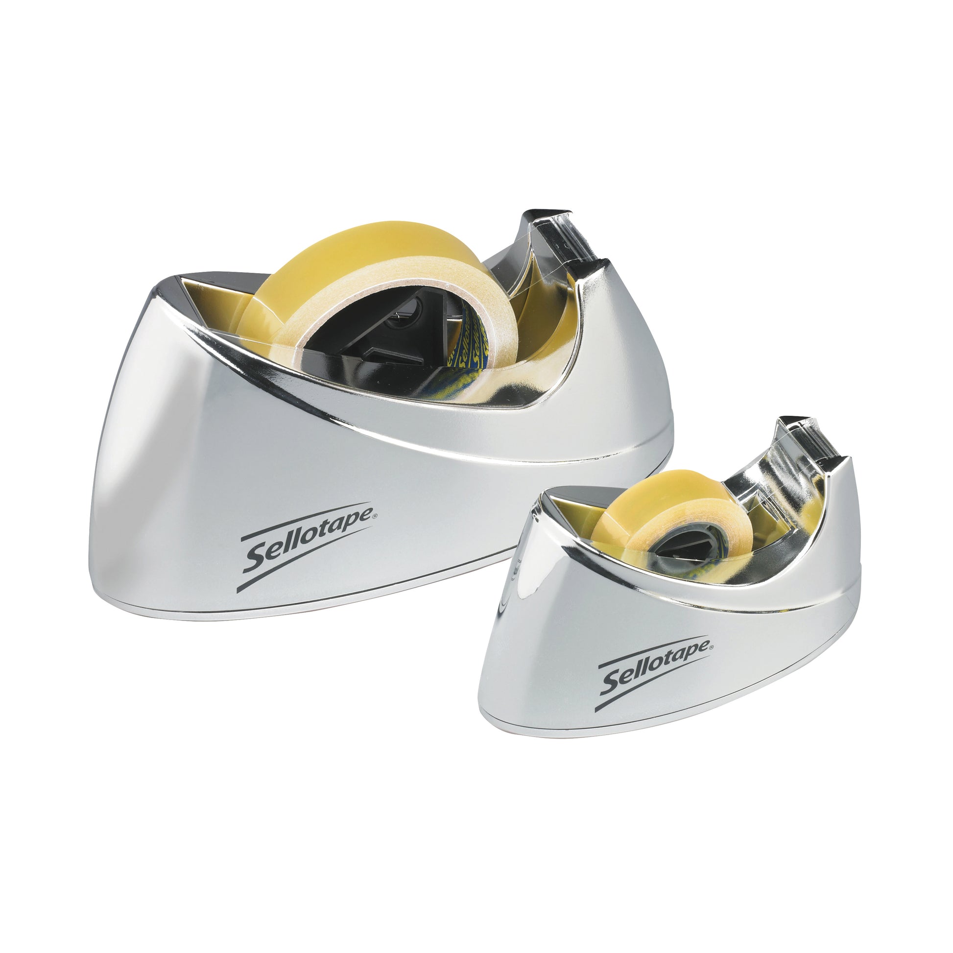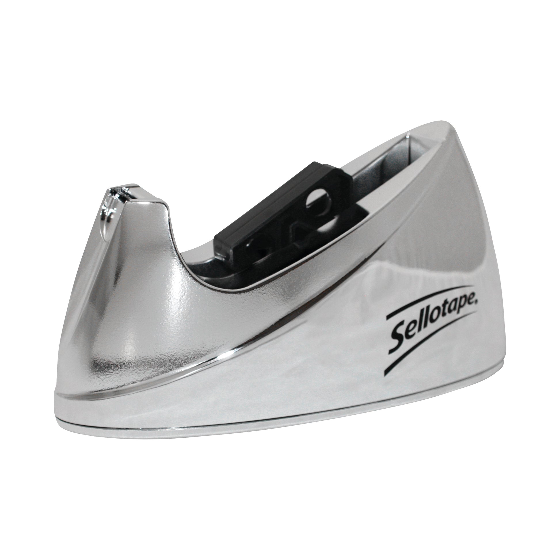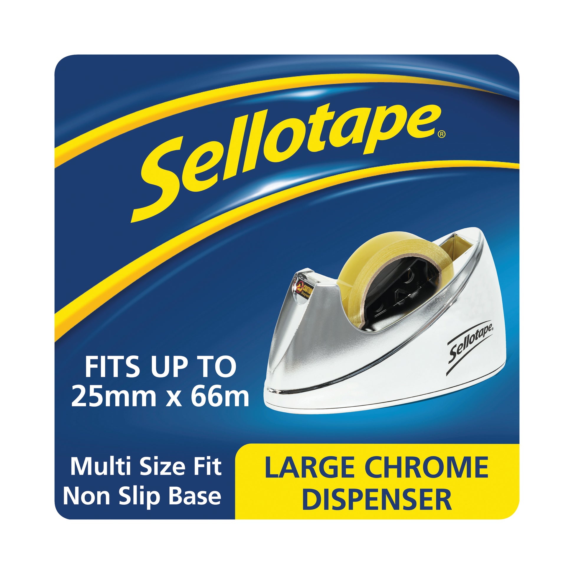 Sellotape Chrome Tape Dispenser Large 25mmx66m 575450 Sleek chrome finish. Non-slip base for easy dispensing. Suitable for rolls of Sellotape up to 25mm wide and 66m long. Easy and clean tear. Find the tape end hassle free. Refillable.