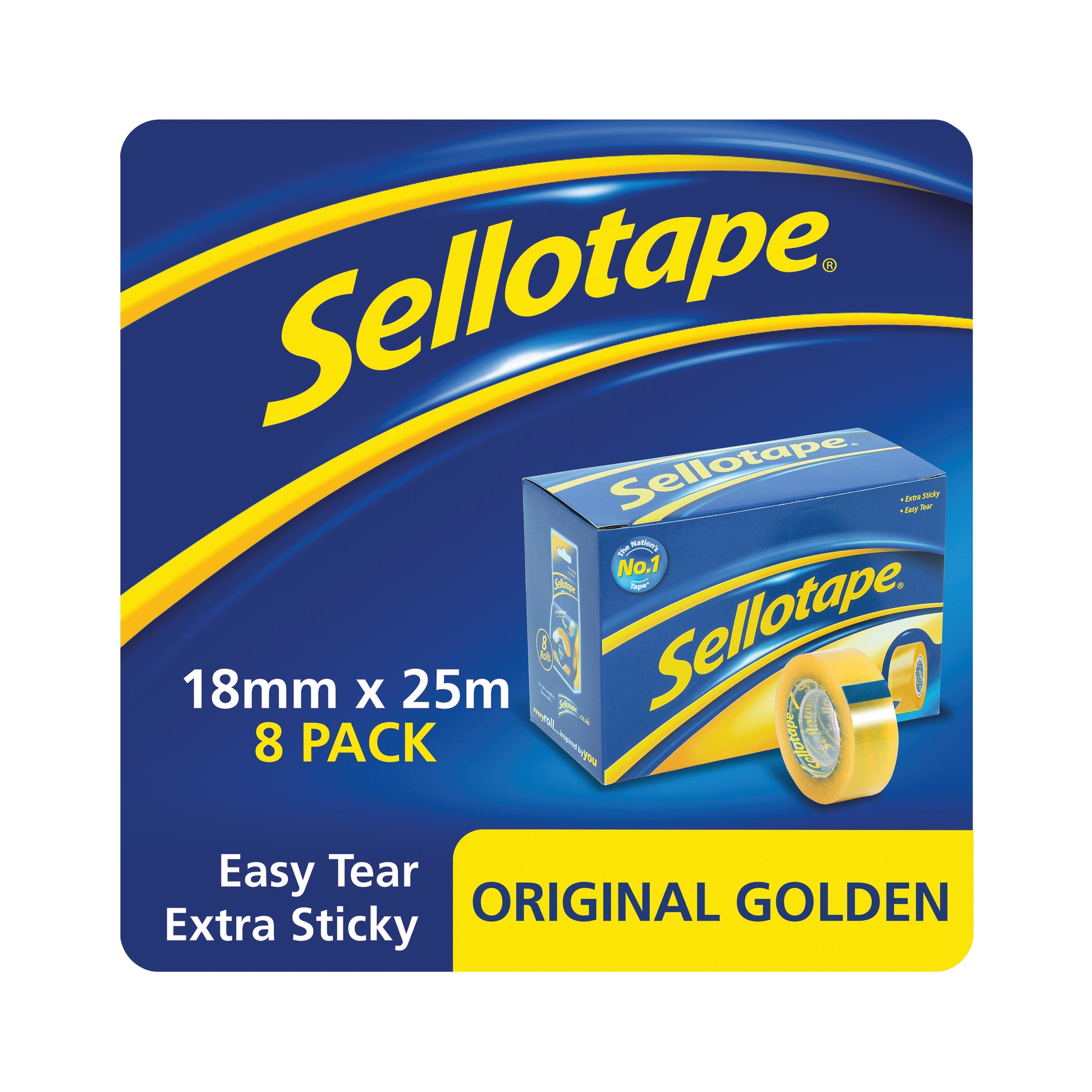 Sellotape Original Golden Tape 18mm x 25m (8 Pack) Golden in colour, but clear when applied. Easy tear, no need for teeth. Small core. Size: 18mm x 25m. Pack of 8.