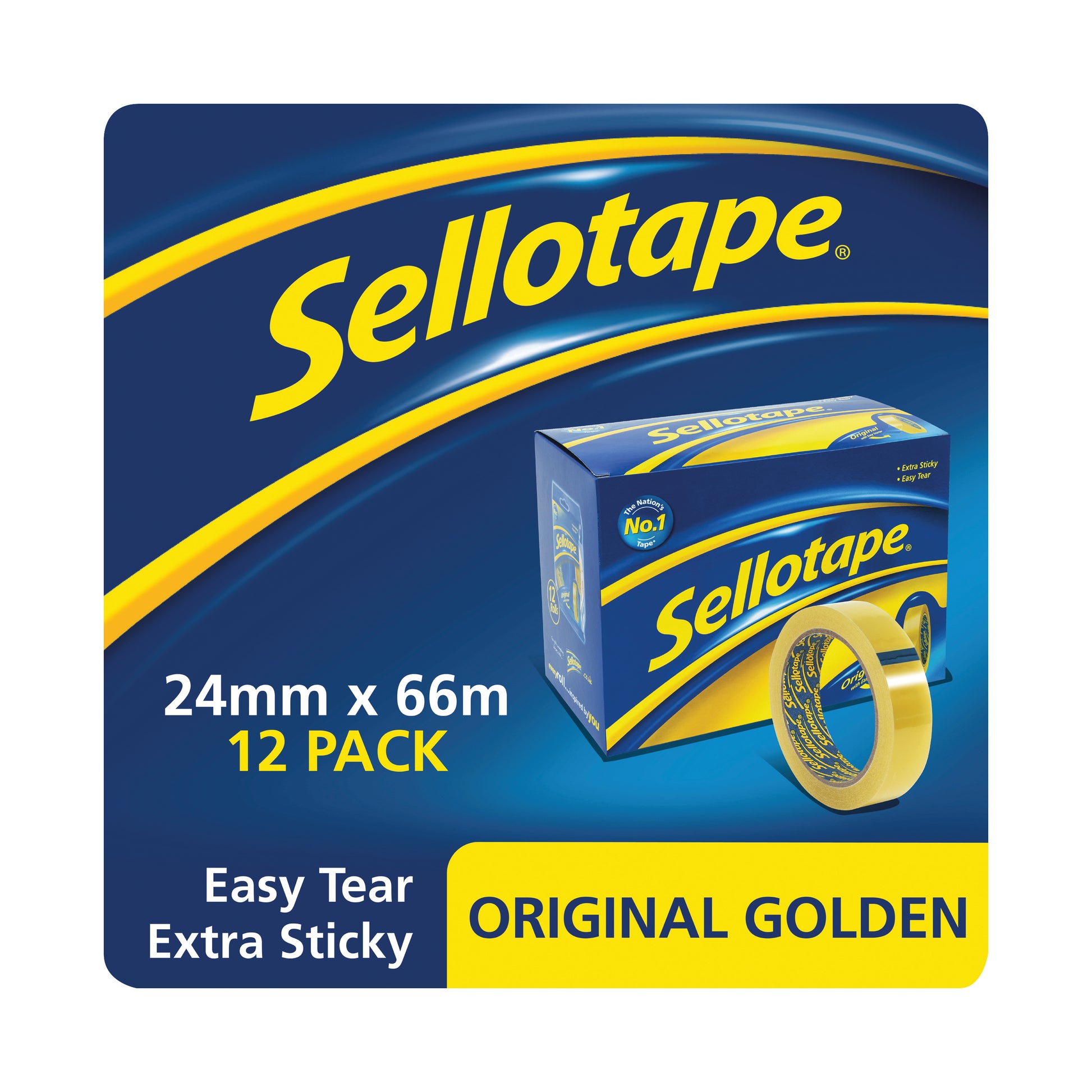 Sellotape Original Golden Tape 24mmx66m (Pack of 12) 1443268 sticky tape. Extra strong and extra sticky. Golden in colour, but clear when applied. Easy tear, no need for teeth. Large core. Size: 24mm x 66m. Pack of 12.