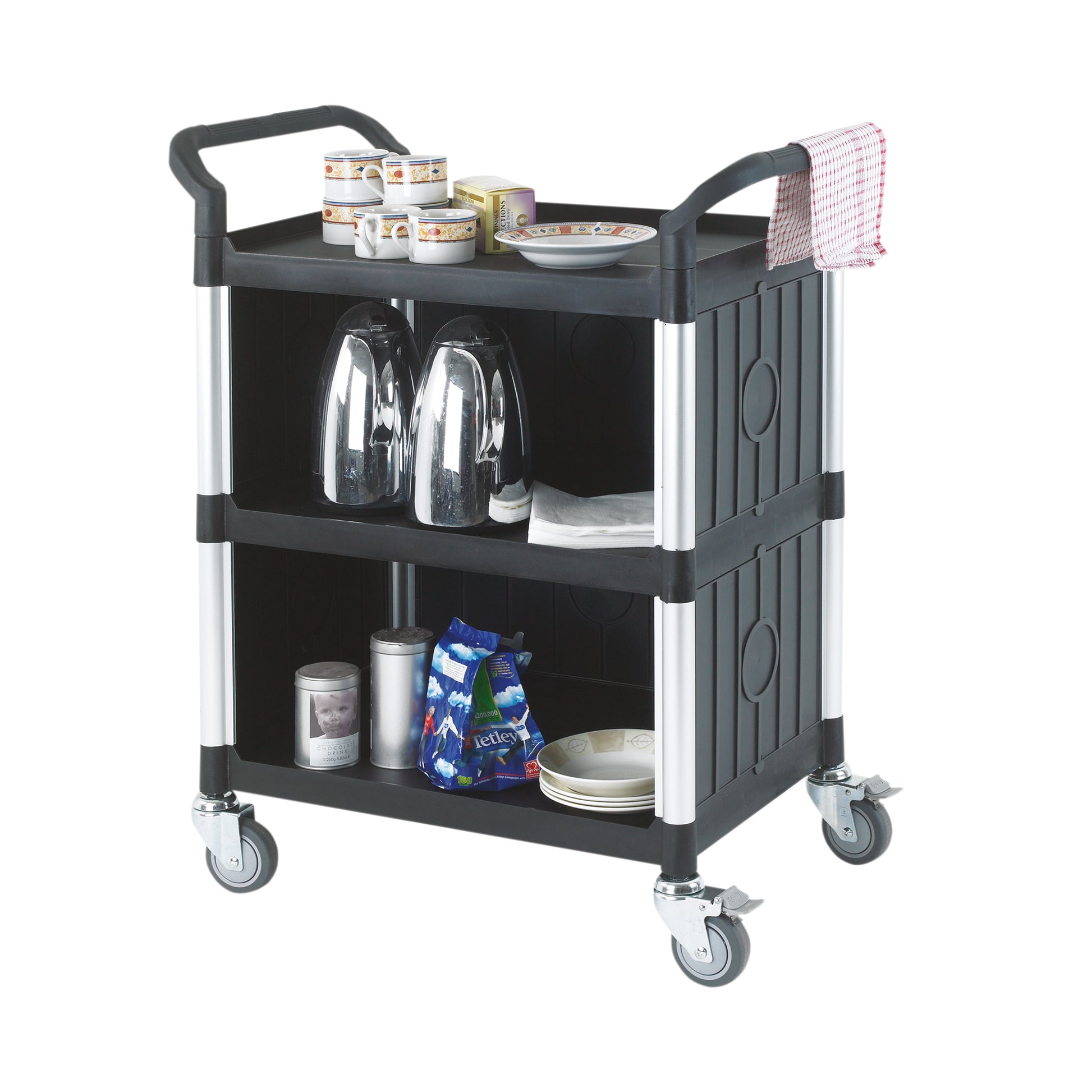 Ideal for front of house use. Plastic construction. Supplied on 4 x 100mm castors (2 braked). Enclosed on three sides. Dimensions - 750 x 460 x 980mm. Capacity - 200kg. Non returnable.