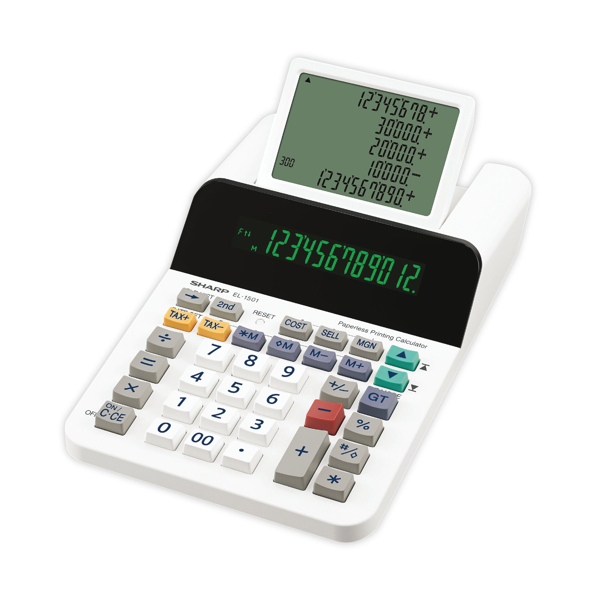 The EL-1501 Compact Paperless Printing Calculator is a unique and powerful calculator, perfect for those that need the power of a printing calculator with the functionality of a desktop calculator. The EL-1501 features a 12 digit backlit LCD display with a 5 line scrolling LCD display. This larger scrolling display allows a user to go back and view up to 300 previous entries. The Compact Paperless Printing Calculator is whisper quiet, making it usable in any office environment. Other features include Cost/Sell/Margin, 4 key memory, tax keys, change sign key, grand total key, backspace key, and selectable decimal and rounding keys. This unique compact paperless printing calculator is cordless and powered by 4 AA batteries. 6 month limited warranty.