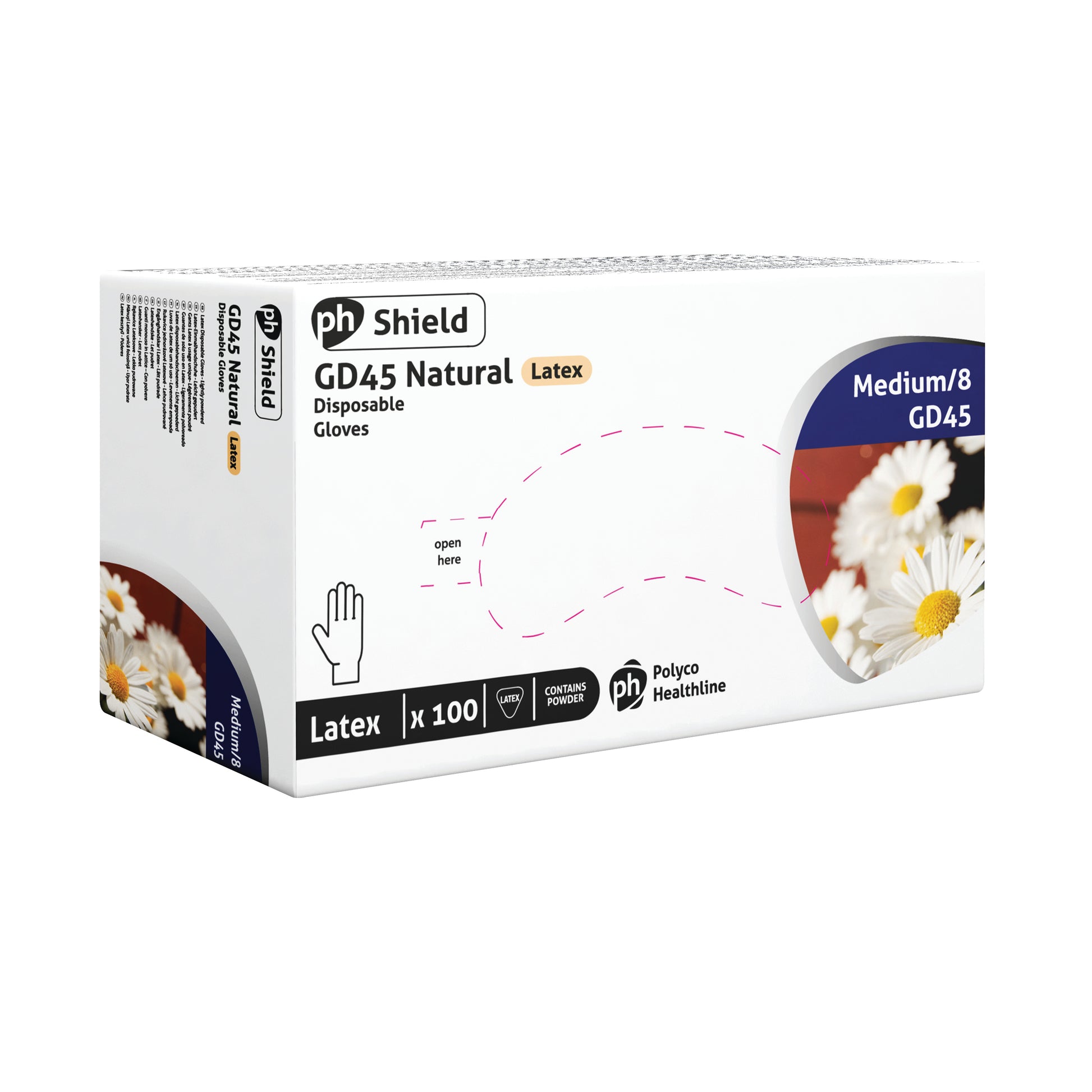 Shield Powdered Latex Gloves Medium Natural (Pack of 100) GD45. Use within the Agriculture Automotive Cleaning Food Industry Painting, Printing professions. Complies to Medical Devices Directive 93/42/EEC, European Standards EN455 parts 1 2 3 EN388 EN374.