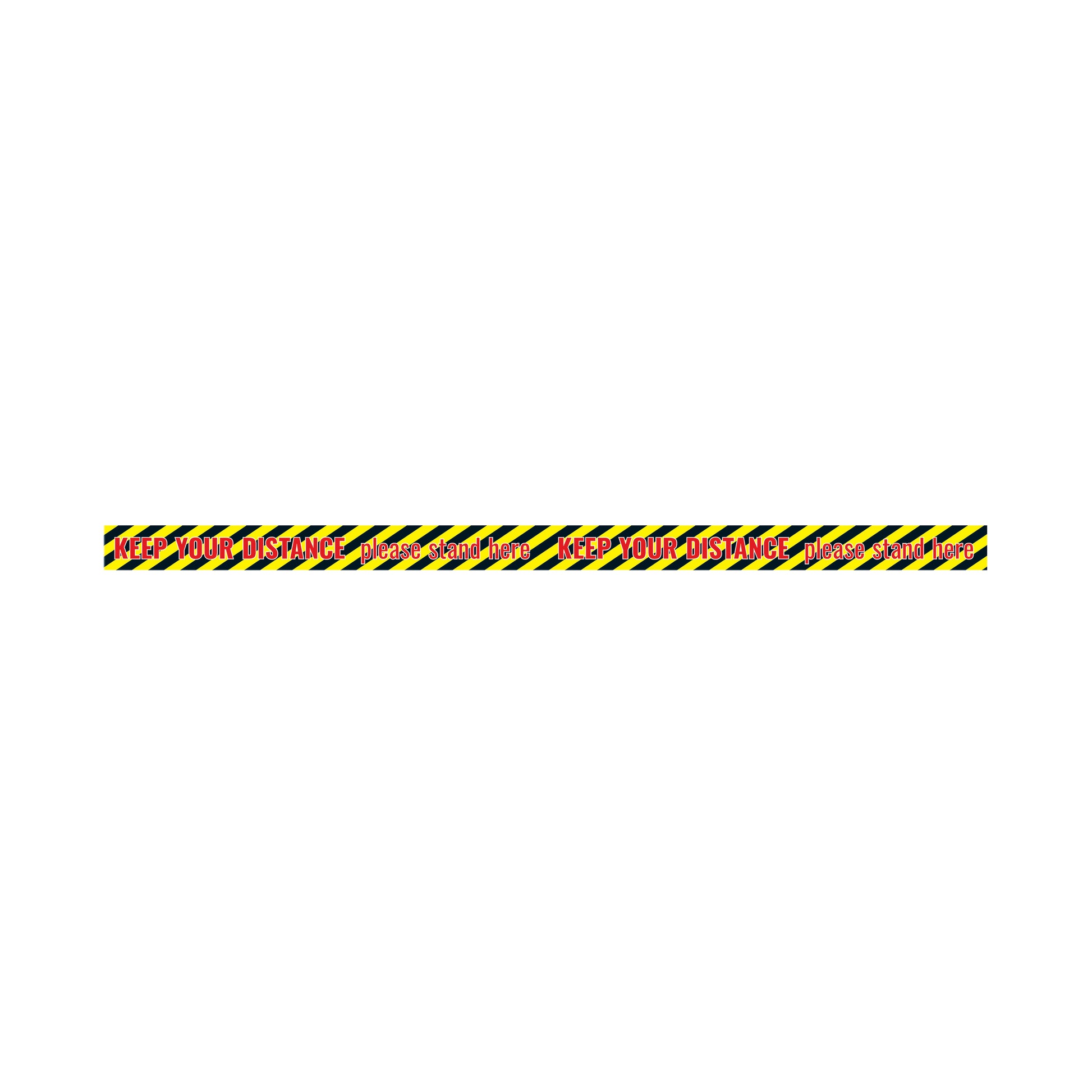 Social Distance Sticker 1300x60mm Tape (Pack of 5) Socialstick04. Floor graphics for social distancing. Made from anti slip, vinyl laminate. Easy to apply with self adhesive backing. Dimensions: 130mm x 60mm diameter. Colour: Black/Yellow. Pack of 5.