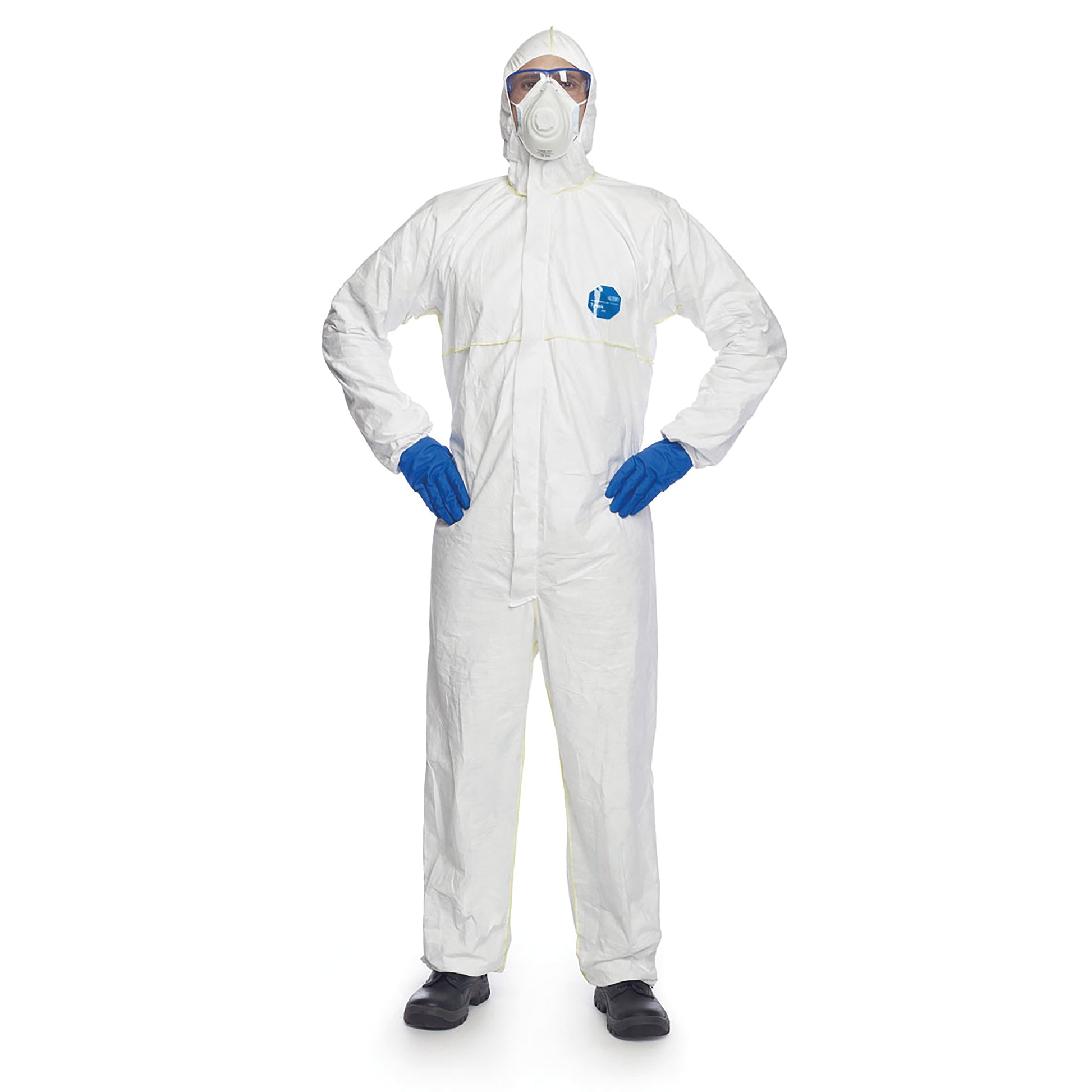 DuPont Tyvek 200 Easysafe Coverall. Polyethylene non-woven fabric. Front zip with storm flap. Elasticated face, wrists, waist, ankles. Type 5 protection against particles. Type 6 protection from limited liquid splashes. Anti-static on outside.