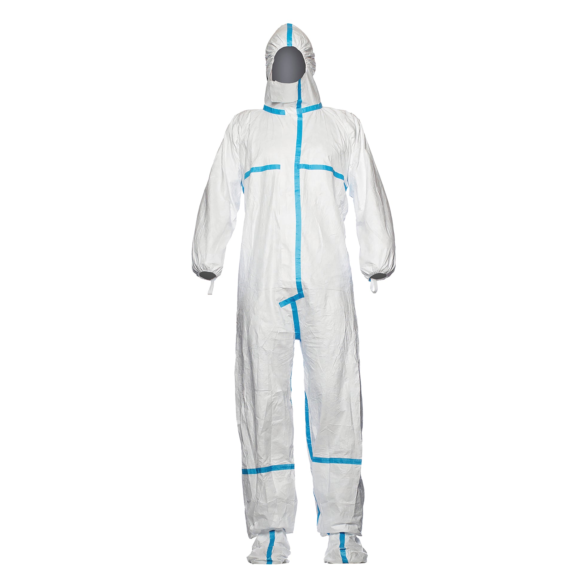 Dupont Tyvek 600 Plus Comes with Socks. Hooded Coverall with zipped closure and self-adhesive chin flap. Attached socks and boot flaps. Stitched and over taped seams. Thumb loops to keep sleeves in place.